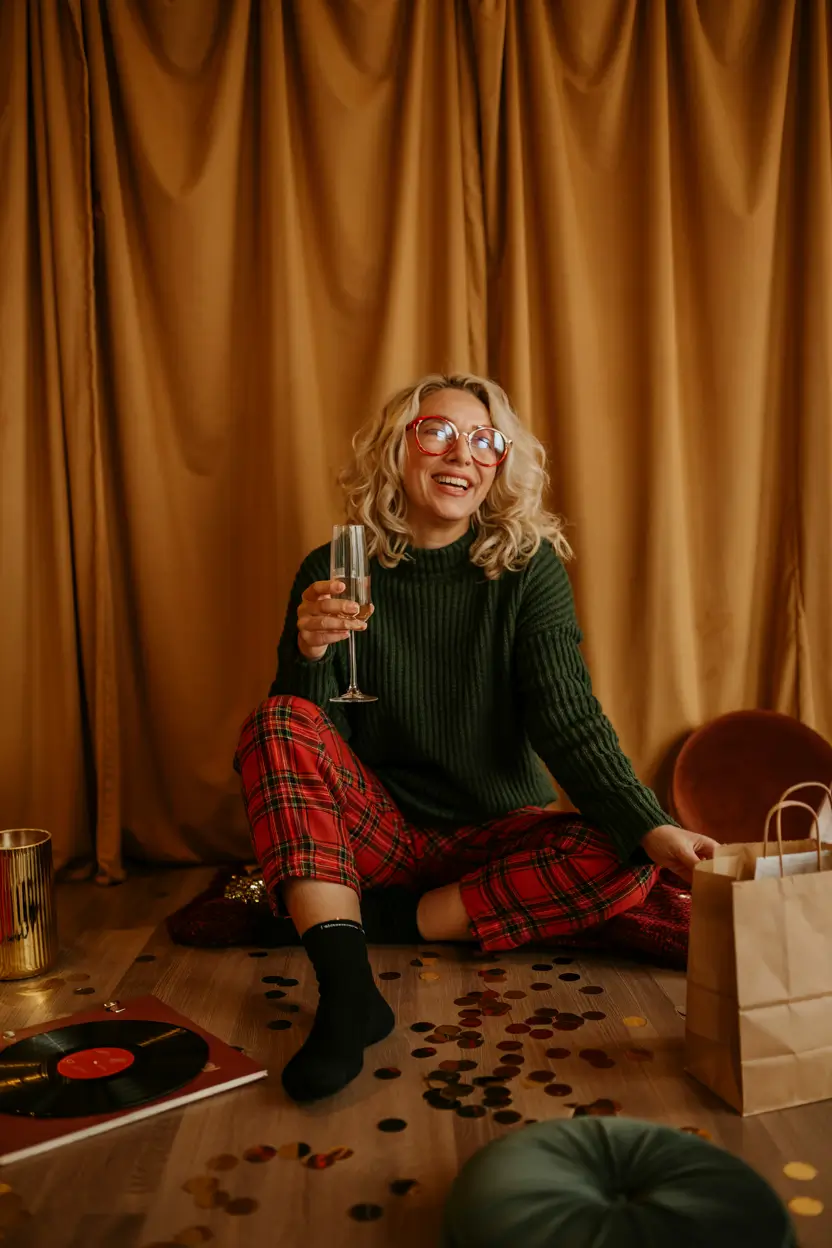 Nothing says festive luxury quite like sequined trousers paired with a creamy turtleneck. It’s modern, minimal, and quietly radiant. I adore how the best christmas outfits this year blend loungewear comfort with statement sparkle — and this one embodies that perfectly. It’s an outfit made for champagne toasts and cozy living rooms glowing with fairy lights.