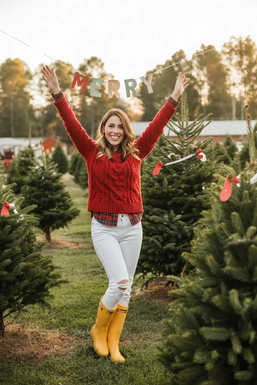 A festive holiday spirit has been beautifully captured in the distinct world of plaid and knitwear. Illustrated in the red knit overlaying the tartan, and the white jeans and yellow rain boots is pure, unadulterated joy. This ensemble is characterized with a sense of nostalgia, as well as being warm-hearted and effortless. Surely, this outfit embodies festive fun! These best christmas outfits surely do color and cozy style seamlessly.