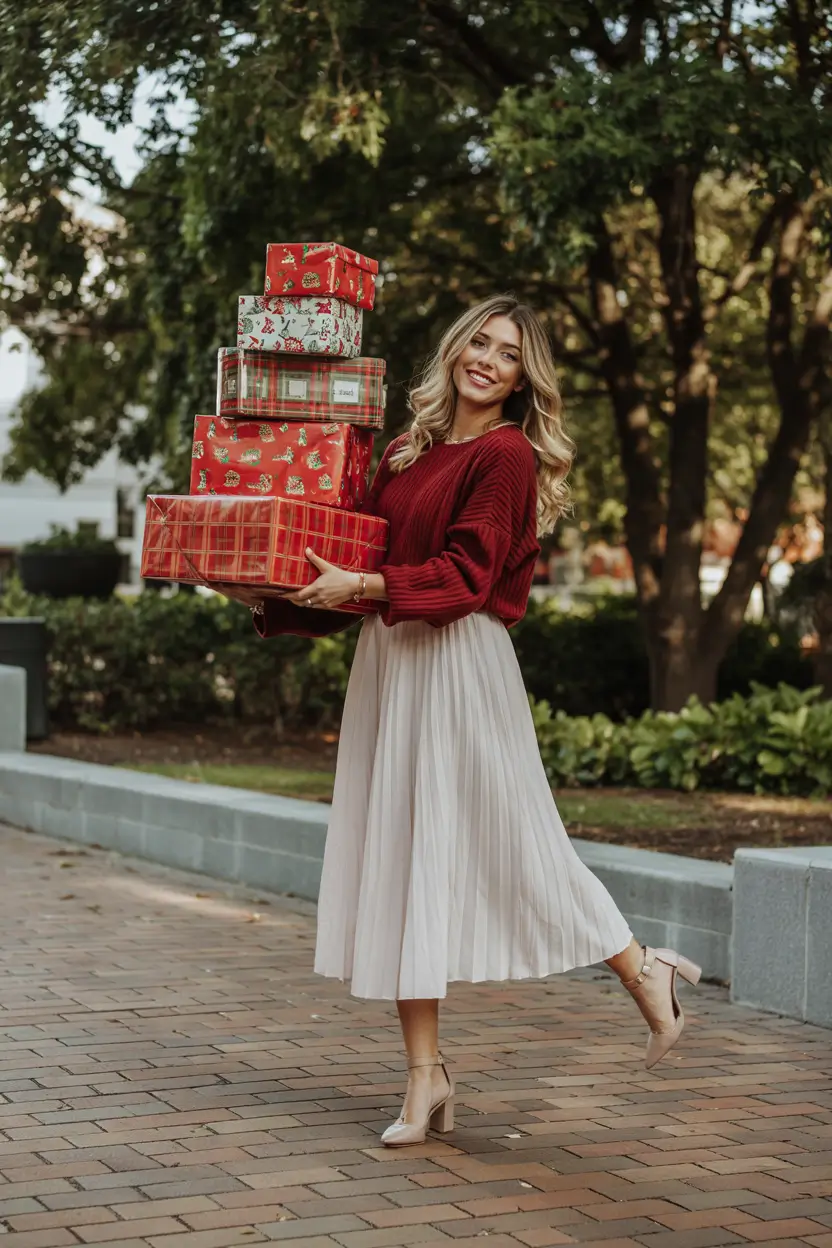 This Christmas look can stand alone as a splendid Christmas card! The deep red hue of the sweater paired with the flowing pleated skirt is elegance in motion. Its soft, timeless, dainty tone is absolutely perfect. With ease, one can say it is the best pleated skirt with a red sweater outfit. The heavy knits combined with the airy skirt is a perfect blend of strength and softness.