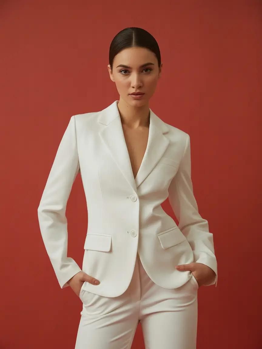 Nothing is like the calm sophistication of white suit. It is sharp, fresh, and impressive in its plainness – an ideal staple when it comes to official dresses among women at work. It is present thanks to the sharp tailoring, and timeless as the palette is minimalistic. I like that it is commanding and gentle at the same time it does not scream to attract attention, but it deserves it.