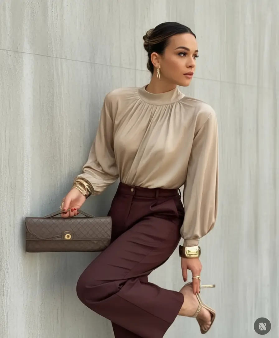 Combining the champagne silk with the deep burgundy is the meaning of low-key glamour. It is one of the most office-appropriate women clothes that are stylish transitional-season wear – comfortable enough in spring, luxurious enough in fall. The art of a loosely cut blouse and the shape of customized pants makes a figure that is at the same time elegant and imposing.