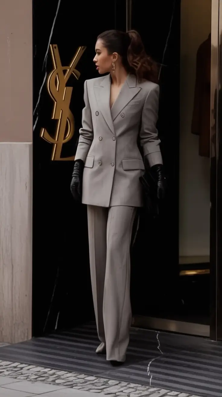 Something very authoritative about gray double-breasted suit. It is elegant without being stiff enough, and it works best with formal clothes among women when they need to leave a memorable impression in the workplace or at work. The loose-fit trousers make the figure relaxed and the angular tailoring on the shoulders makes the figure strong.