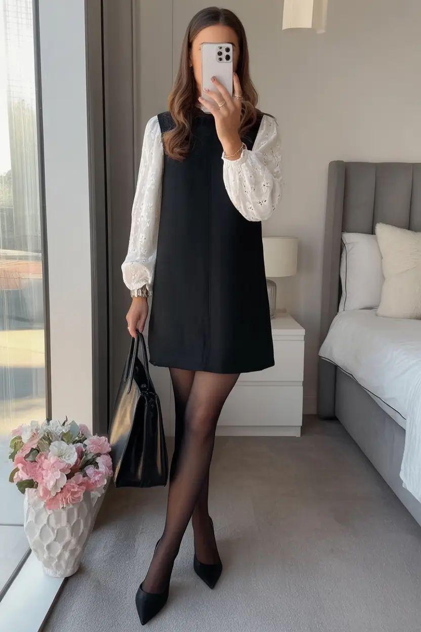 Minimalism has some magic in it, and this black-and-white appearance embodies it best. The white puffed-sleeved blouse sticks out of a structured black mini-dress, eternal, shiny, and female. It is one of my favorite examples of formal outfits to women who are classy but also those who enjoy French style of elegance.