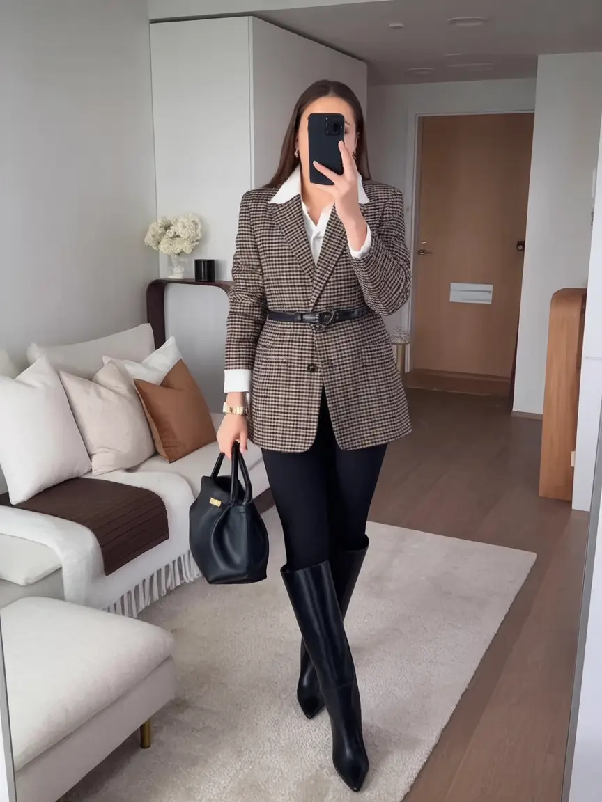 The appearance of this checked blazer is the epitome of urban chic and a proud combination of old-fashioned tailoring and new attitude. The belted waist provides form with the accent on shape but the energy is carefree and relaxed nevertheless. It is worn over black leggings and high boots and it is one of those official outfits of women winter combinations which are practical and poised at the same time.