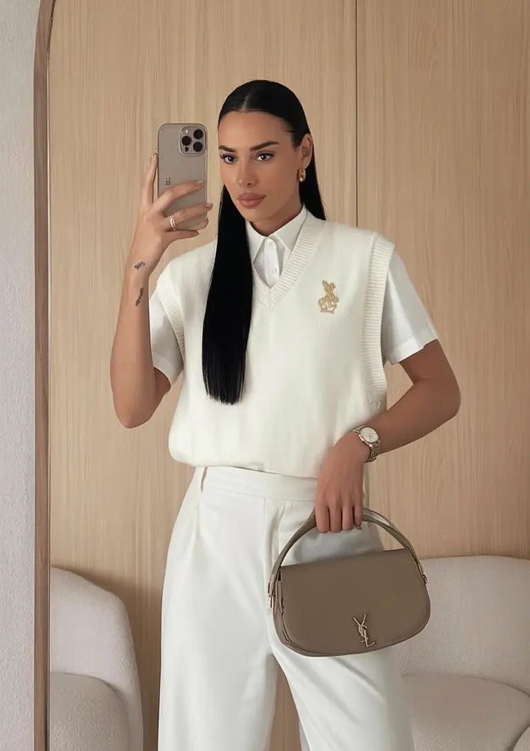 There is a language of all-white outfits, silent, impeccable, and eternal style. This knit vest worn over a collared shirt is a dashing daydream in formal clothes both at classy and formal outfits to wear in summer, female. The lack of color and the straight lines of sophistication are silently spoken.