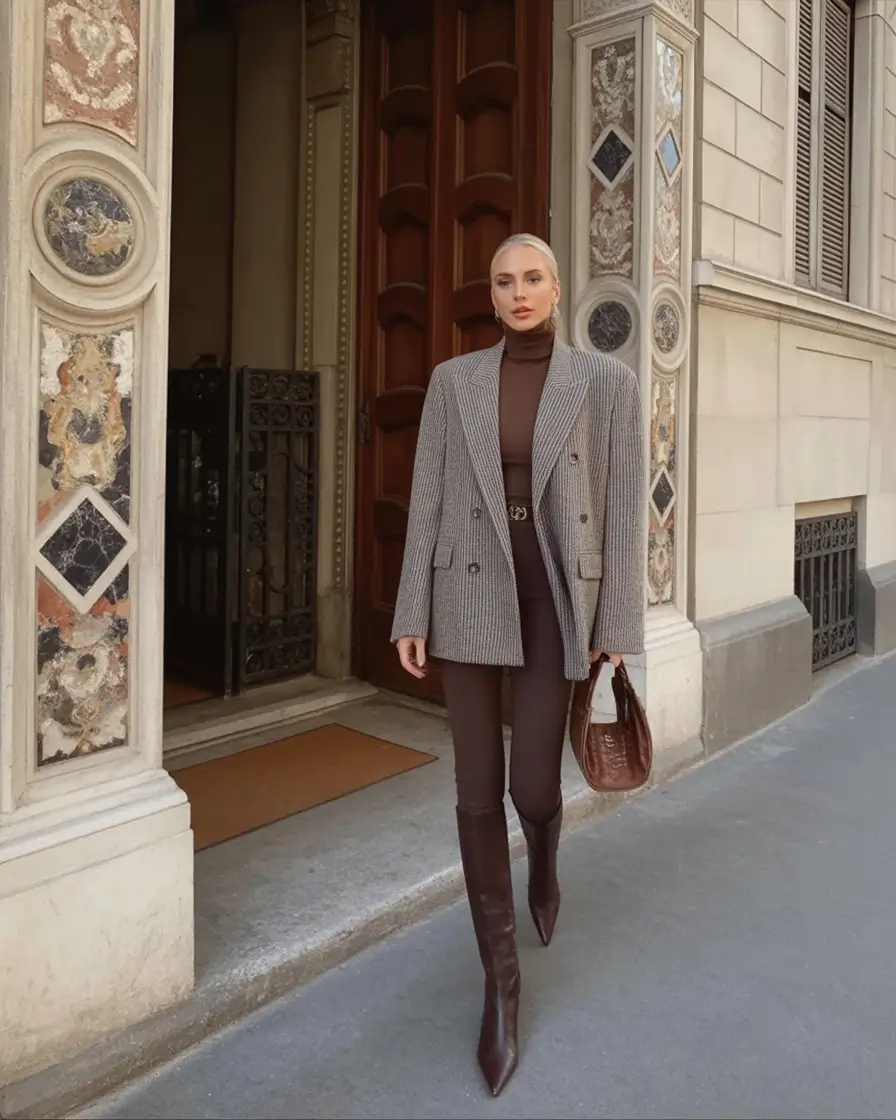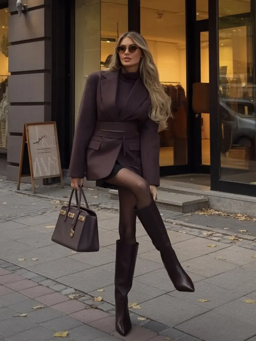 This look defines rich autumn elegance — deep plum tones layered with precision and grace. The tailored blazer and turtleneck combination feel luxurious yet strong, perfect for formal outfits for women winter when texture and tone matter more than ever. The mini skirt paired with tall boots creates harmony between structure and sensuality, while the monochromatic color palette elongates and refines the silhouette.