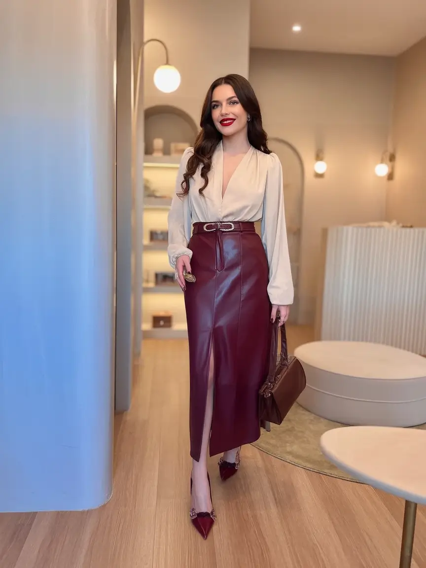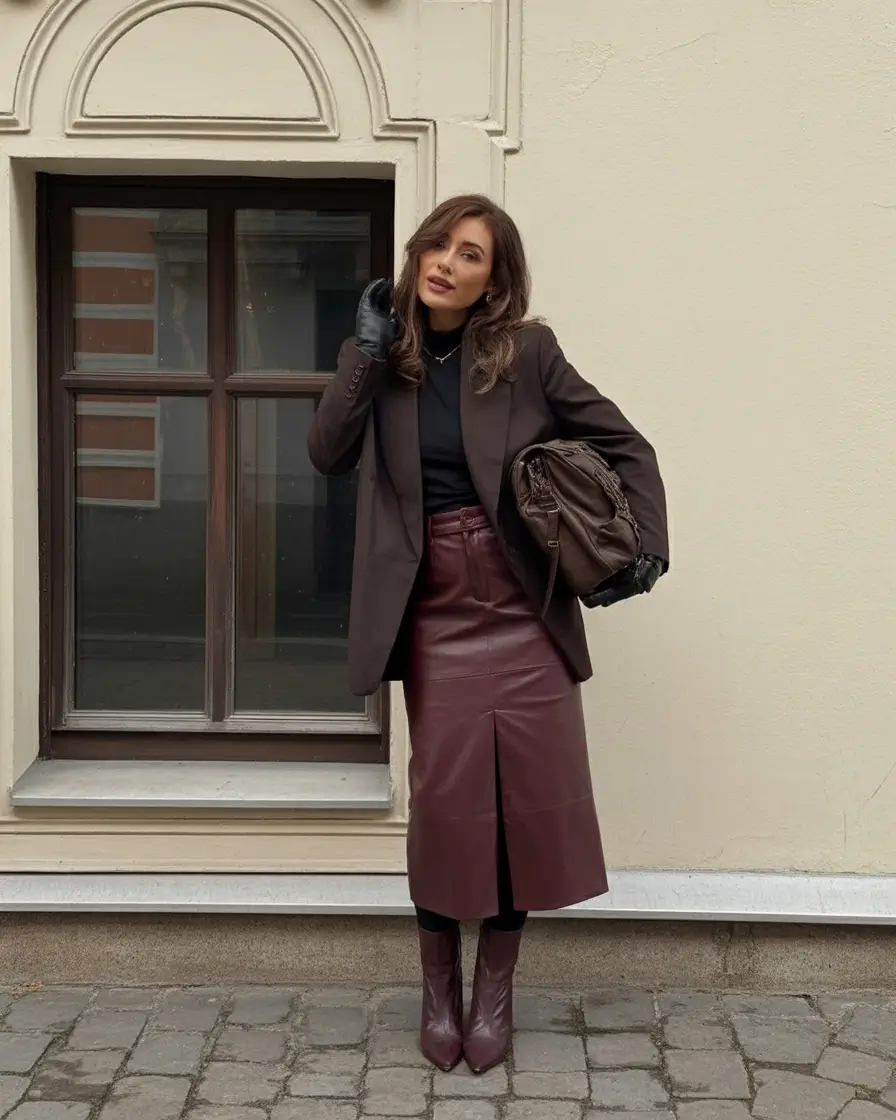 This rich wine outfit is an image of elegance, a belted blazer and A-line leather skirt collide to give one memorable outfit. The color itself is a gorgeous compromise between burgundy and berry, thus being an aggressive yet classy color to include into formal wear of women during winter and elegant evening attire.