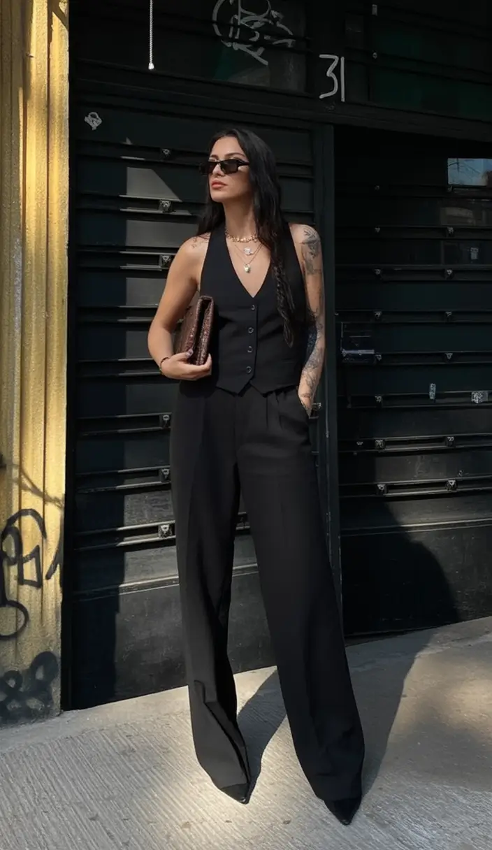 Black does not require any introduction, it is classical, captivating and all-purpose and endless. This sleeveless waistcoat and wide-leg trousers combination characterizes the new generation of feminine formal clothes that are classy, minimalistic uniform of those who understand that confidence is the most significant accessory. It is smooth enough to wear out to women parties in serious outfits, but is also loose enough to wear on a summer evening when you want to dress sharp and carefree.