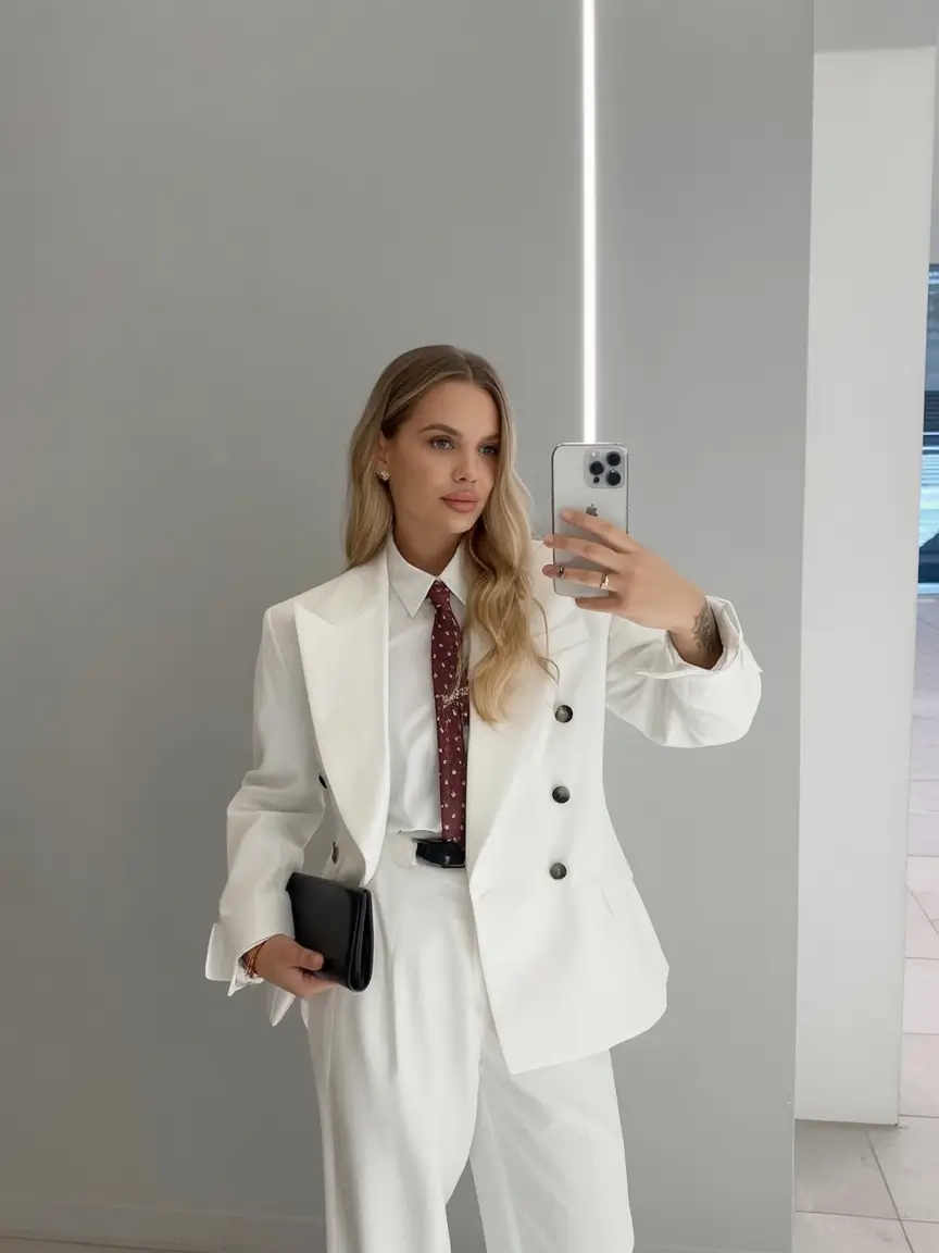 Something tends to be irresistibly clean about all-white tailored suit, and this one is not an exception. The bright blazer combined with the same trousers represent the formal attire of women in the office that has a contemporary twist. A printed tie is the right amount of fun to put it in the youthful relevant and fashionable.