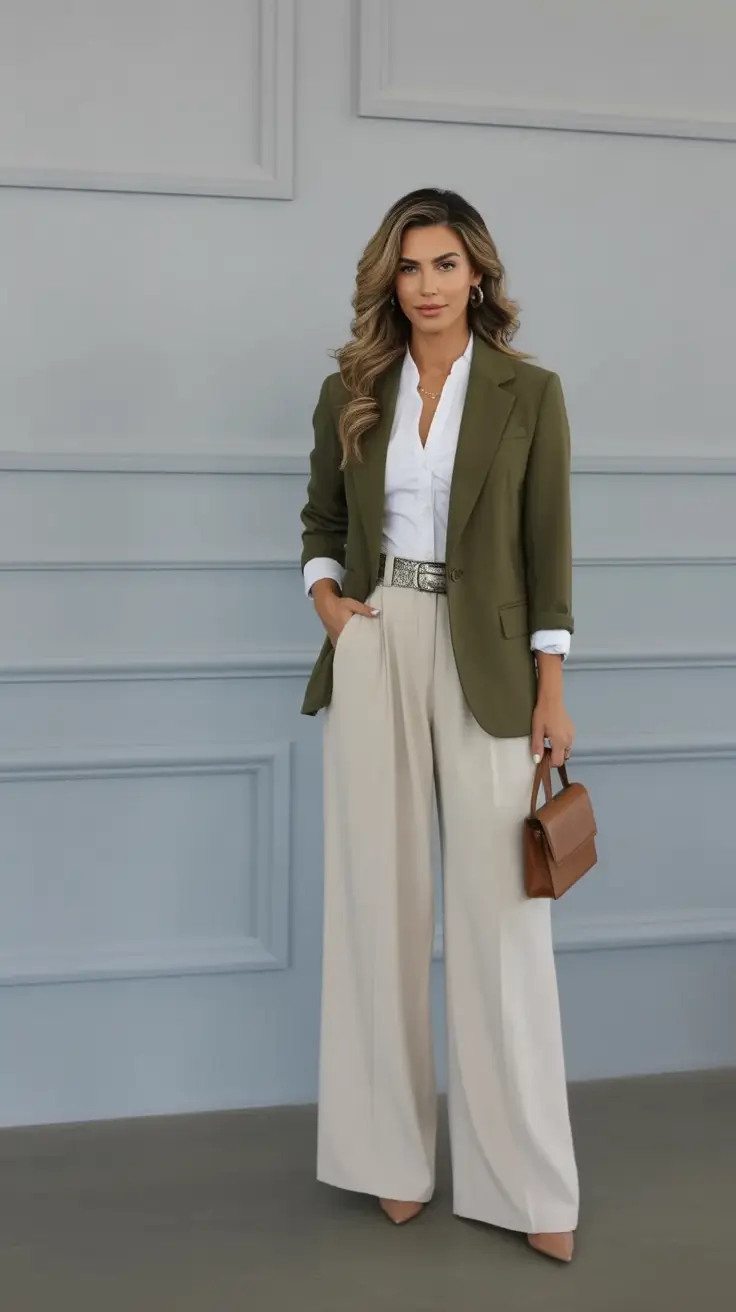 The combination of olive green and ivory makes it the right combination of both the earthiness and grace. It is among my favorite mixes of formal female work wear since it is business like but at the same time informal. Something in these low keys is so easy, particularly in contrast to tailoring, which is made in a structure.