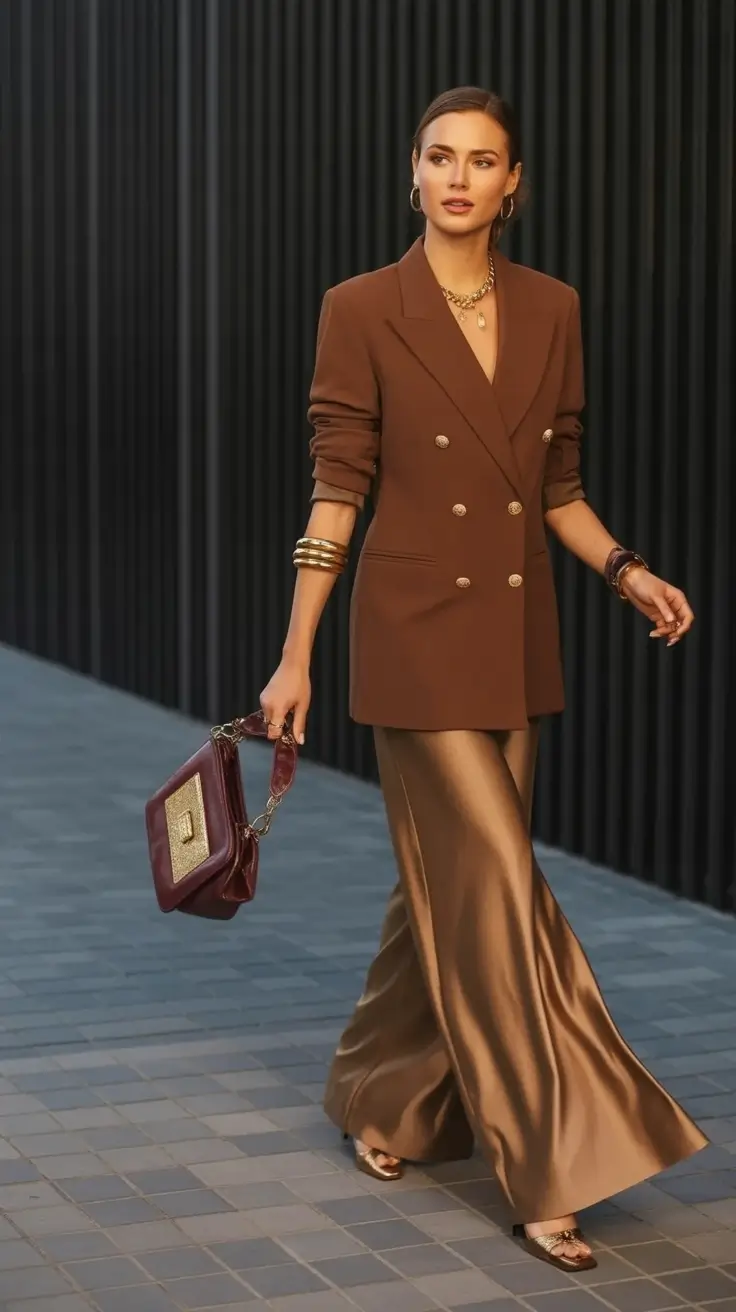 The brown is making a comeback, but not the boring and business-like brown of old times, but a rich bronze and chocolate brown that is tactile and luxurious. This is an ideal outfit of the lady formal winter outfits, with their shiny satin pants and two-breasted blazer. It is the warmth to be wrapped in confidence.