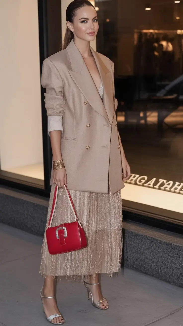 The sharpness of the tailoring of the vest brings the structured appearance to the loose trousers, forming the ideal balance between body and movement. Coupled with necklaces in layers, heels pointed, and a statement clutch, this outfit is a new interpretation of power dressing in 2026 – it is lighter, sharper, more personal.