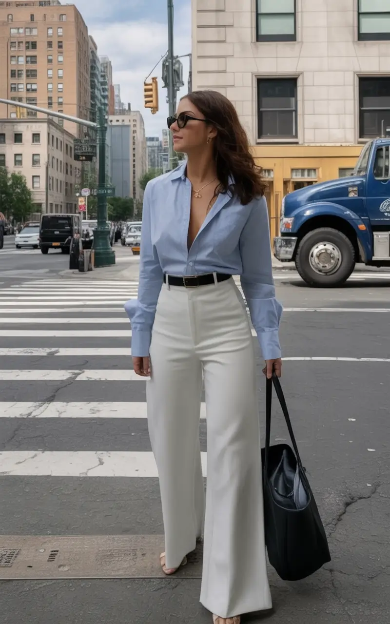 There is nothing as easily elegant as a tucked in blue shirt and high waisted white pants. This is what polished simplicity means and it suits the formal dresses of women in offices. The blue cools the white crisp and forms a clean contrast, which is strong but serene. I adore the juxtaposition of the crisp lines of the pants with the slackness of the shirt, the structure that is business-appropriate and the casualness of a lunch date in the city.