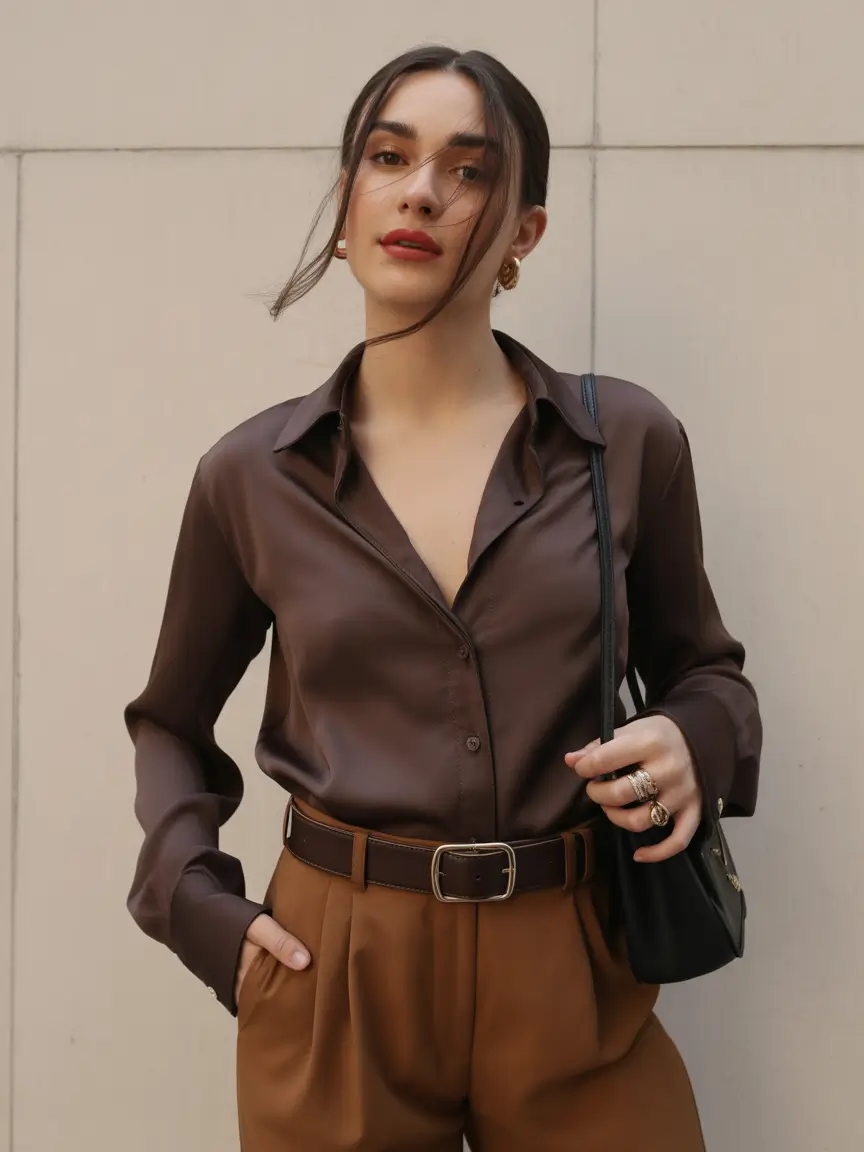 Something about tonal dressmaking is just too sophisticated to resist and this dark chocolate on caramel is evidence. The silk shirt is with a slight shininess that is decadent yet down-to-earth, and the customized trousers balance it in a conventional form. This is my dresscode of choice when it comes to formal business casual outfits in the female section, particularly during the cooler seasons when one would wish to keep everything warm but presentable.