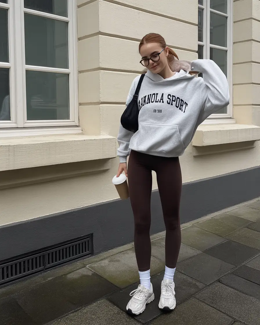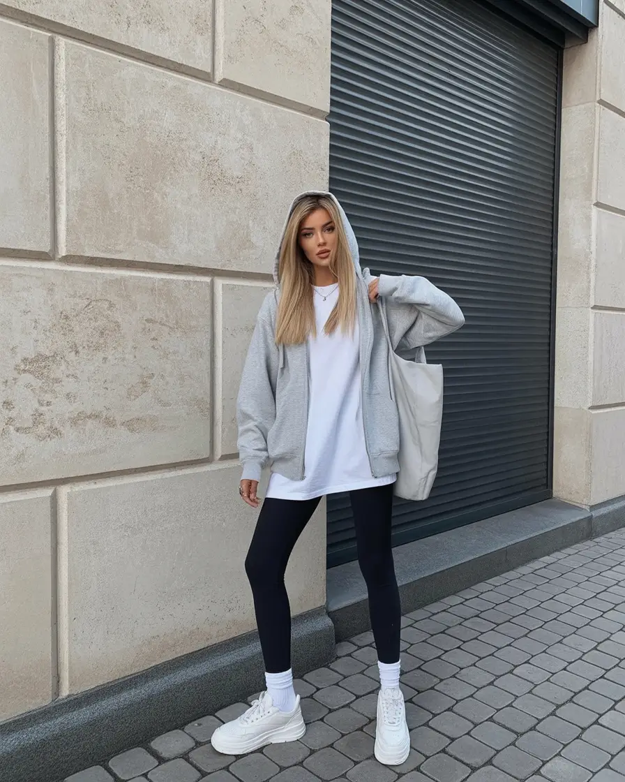 I am fond of such an outfit as it embodies such balance between comfort and direction. The loose, comfy, and liberating oversized hoodie is like a hug, and the fitted leggings make the image more grounded. It is an ingenious game of opposites: urbanity versus rudeness, light sounds versus the harshness of the street. And that is what makes casual fashion so thrilling at the moment, isn’t it?