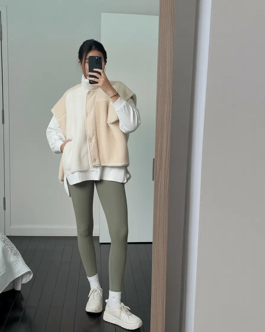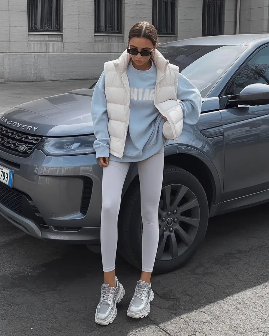 The combination of proportions is my favorite feature here, as the oversized sweatshirt is comfortable, whereas the fitted leggings ensure everything smooth. The vest just has the right amount of volume to make the silhouette balanced and by the way of those reflective sneakers? A minor risk in fashion that can yield. They reflect the light so well and immediately create a lifted appearance on the outfit.