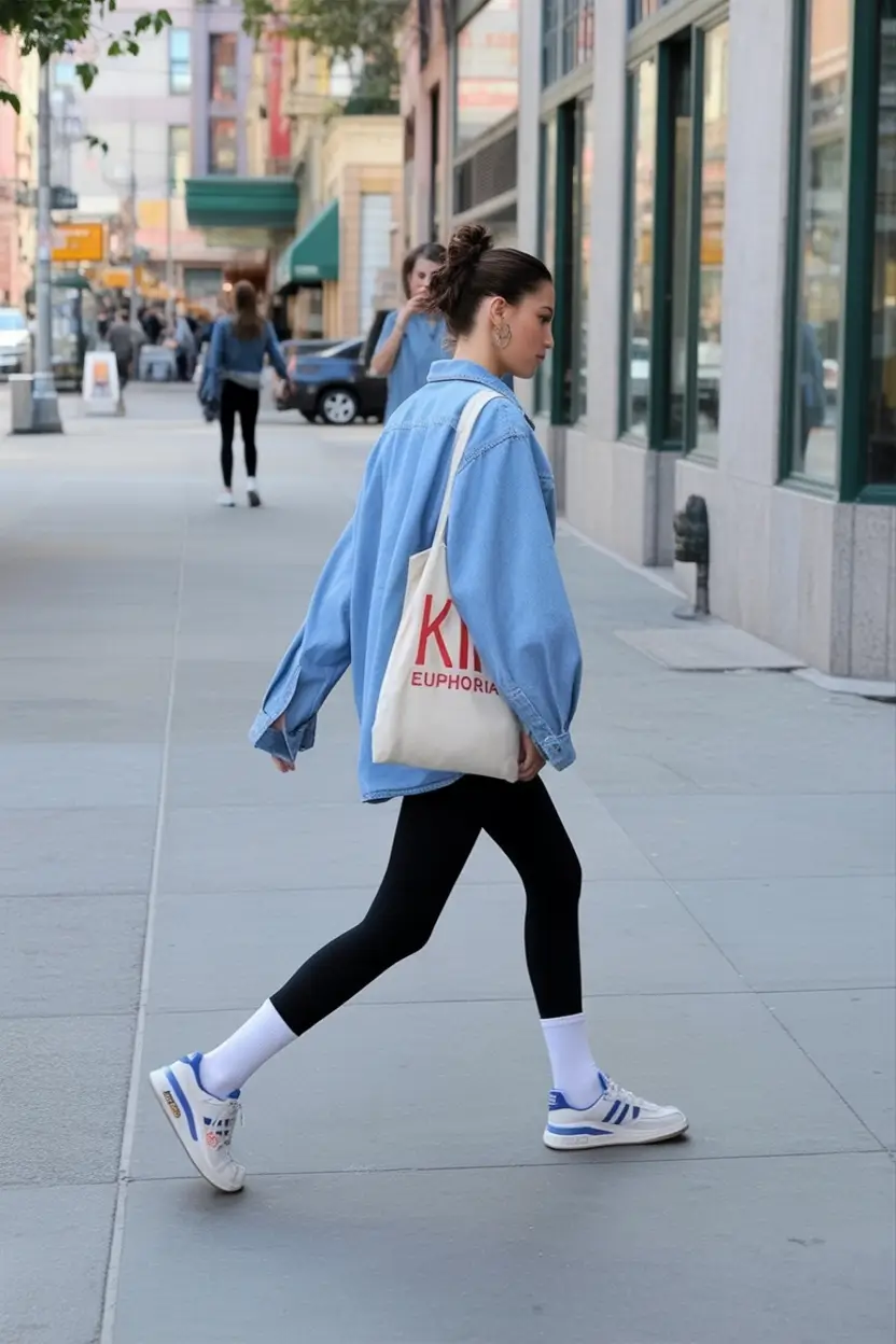 No garment is more democratic than denim- it suits all tales, all towns. A loose denim shirt, black tights, and sneakers of vintage style are urban and friendly, the type of clothing that goes as fast as you do. The tote bag also carries that appearance of something worn, and it is therefore a must to any casual attire paired with sneakers when one spends their day in and out of coffee shops and commutes.
