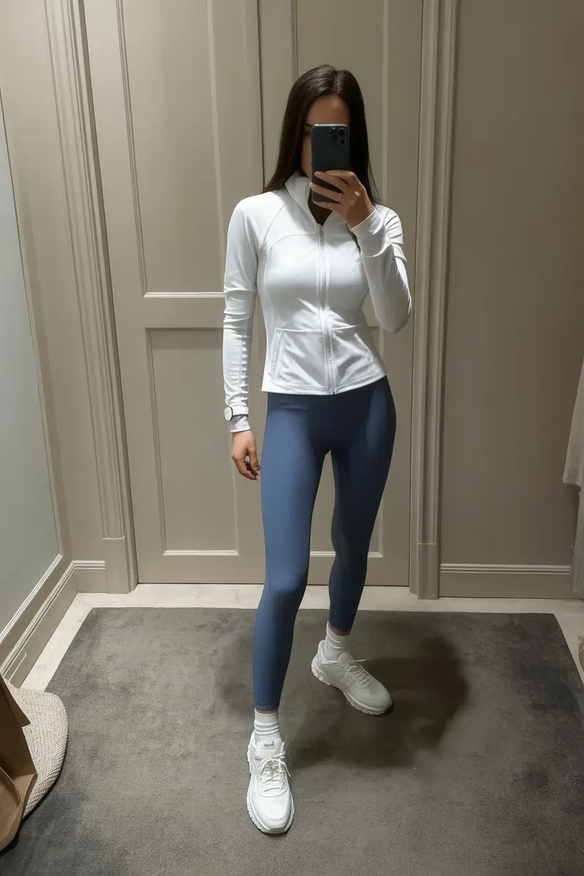 Minimalism has never been so alive before. This appearance is that of the high style of simplicity: white zip-up top, slate-blue leggings, and bright white sneakers. It is quietly self-confident, molded, and, undoubtedly, flattering. Its trim fit is perfect to any Pilates session or that weekend shopping spree where women want to be comfortable having a good workout but at the same time, good outfits.