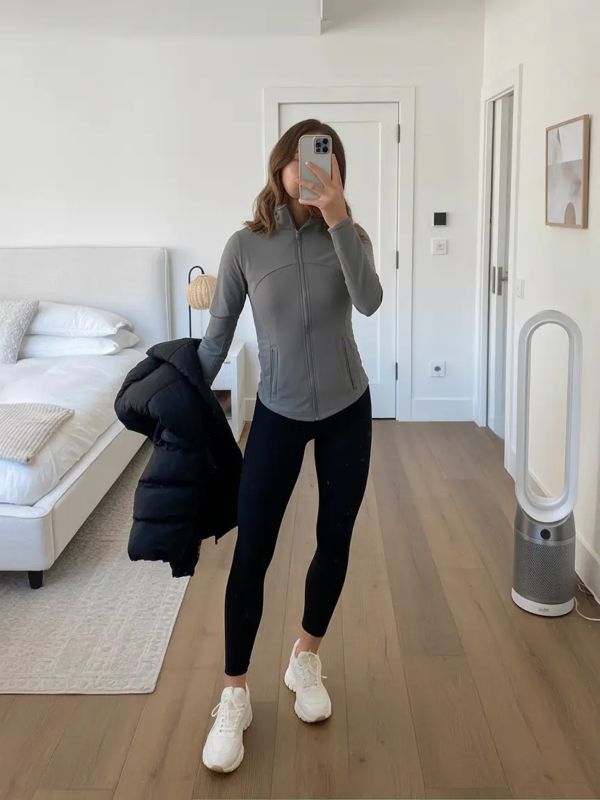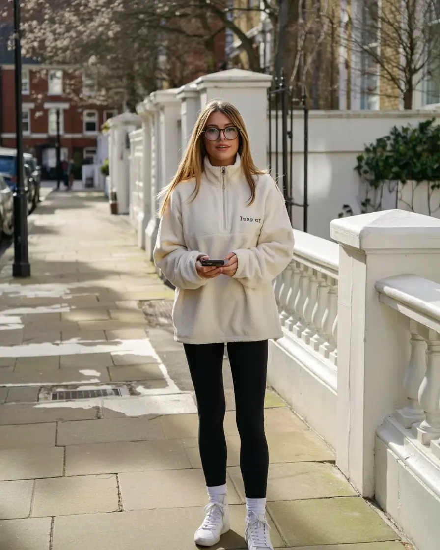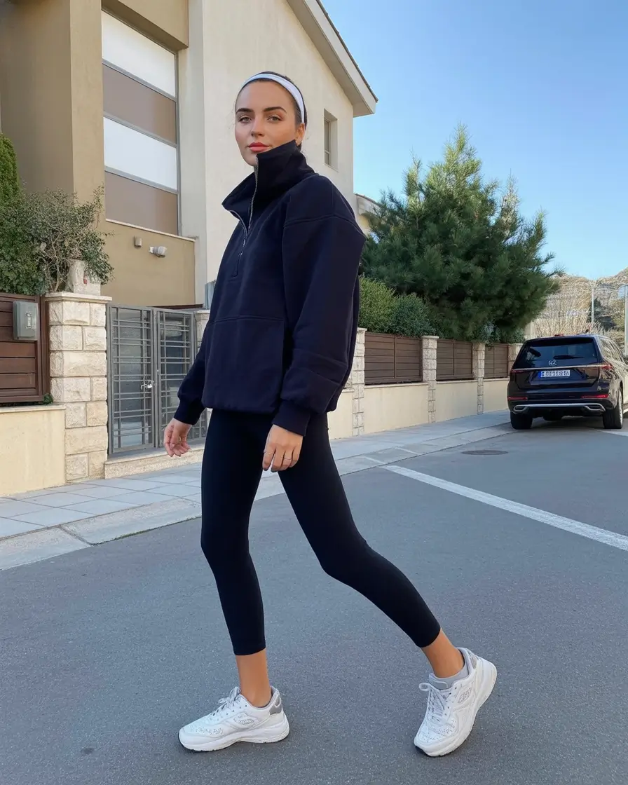 Black leggings and a cozy half-zip fleece, this is the type of style that is not about dressing, but about being comfortable. Put white sneakers on it and the outfit automatically appears sophisticated without making much of an effort to look fancy. It is my favorite clothing sample of casual lives with sneakers in the winter when comfort is of primary priority, but style follows behind.