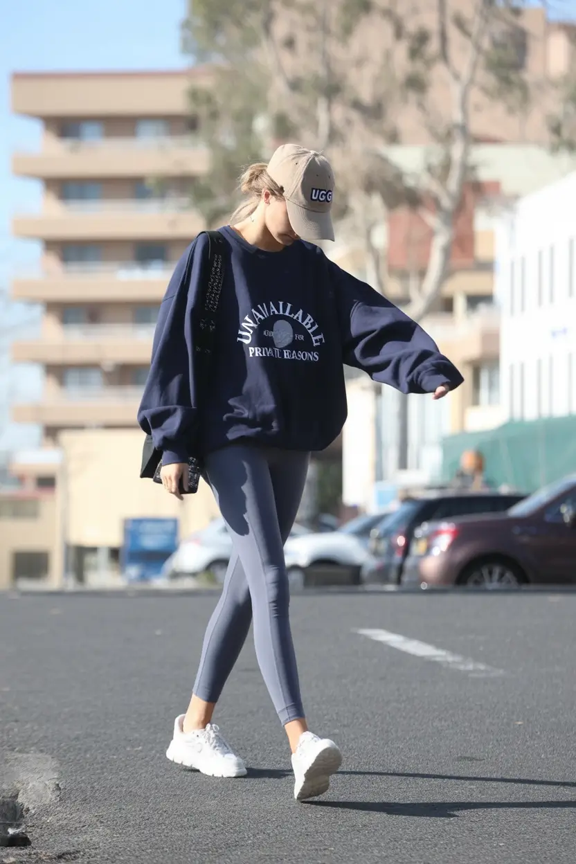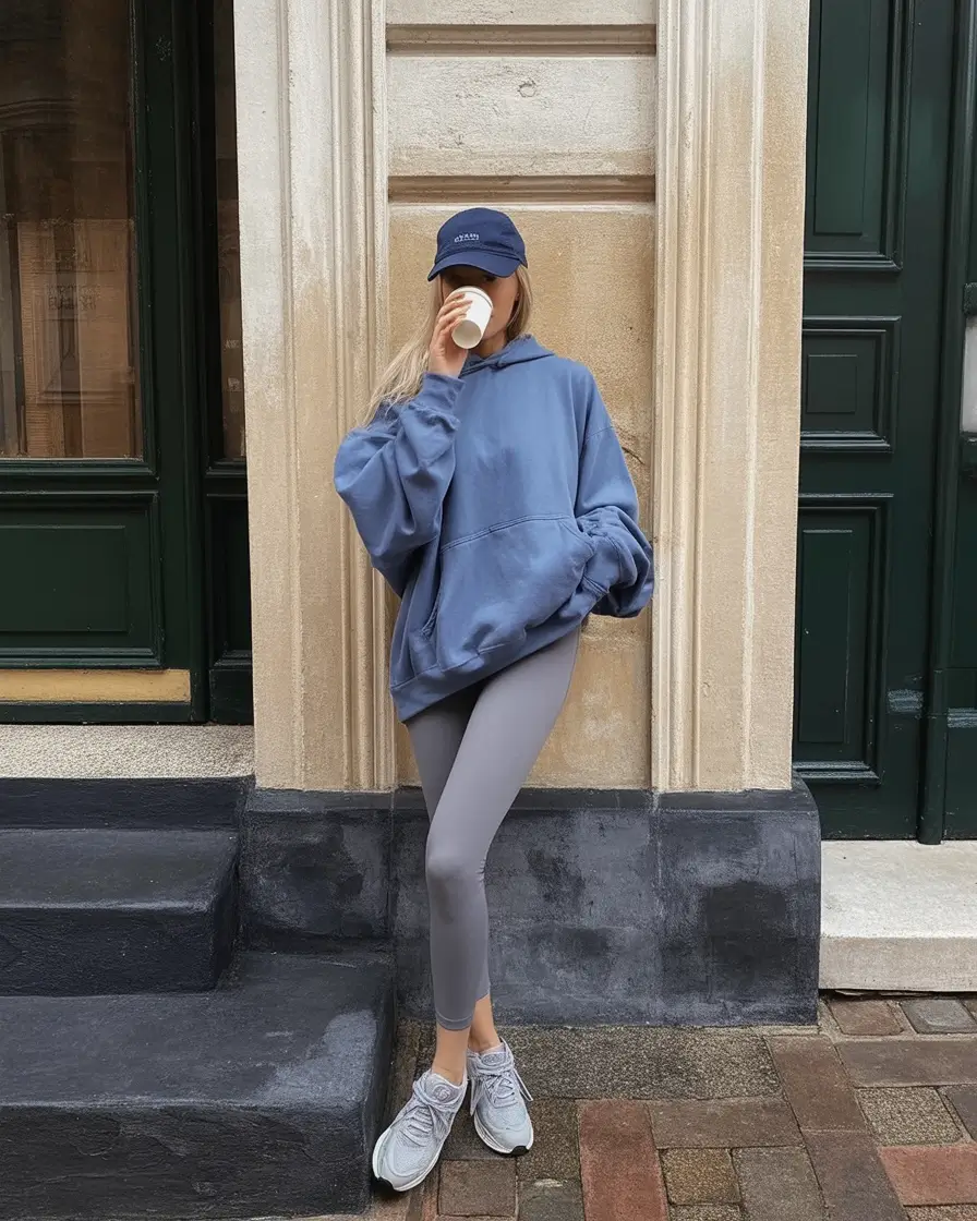 It is an implicit trust that is brought about by disproportionate body size. The combination of a blue hoodie and cool gray leggings and sneakers is a slight monochromatic balance. It is casual but not in a rush, which is precisely what casual attire in sneakers women have become by 2026. The navy cap is the final element of casualness that makes running errands drinking coffee a little stylish.
