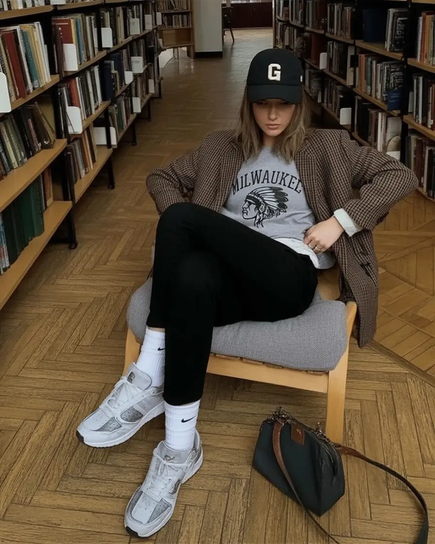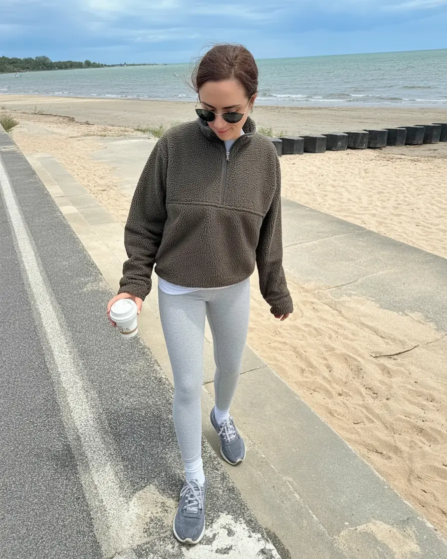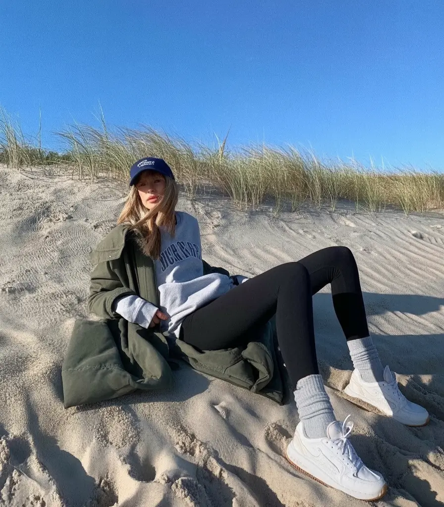 This glance is as though it were Sunday morning by the water, quiet, cool-fresh and a little sentimental. The best pairing is a brown fleece pullover, soft gray leggings and classic gray sneaker. It is an eternal sample of casual outfits sneaker winter when the textures and colorings match each other and keep you in a warm position without appearing heavy.