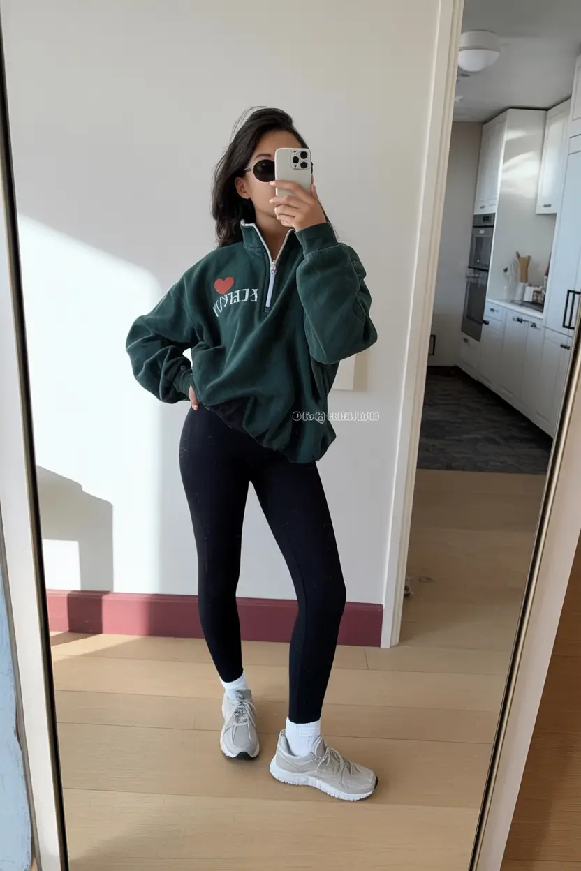 The green half-zip sweatshirt with a dark shade of green is something refreshing. It is solid, almost flat, combined with black leggings and neutral sneakers, which makes it feel and look grounded but luxurious, though there is no excess. This is the type of outfit, which fits perfectly into casual outfits with sneakers fall, when the textures become heavier and the tones become deeper.
