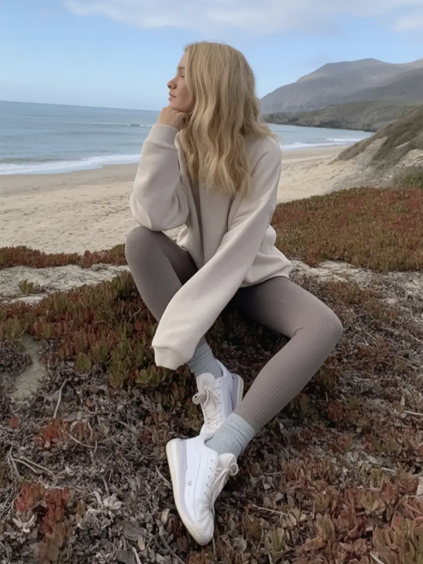 It is the peace one can have with the ocean alone, and this glance has it all. A light beige baggy sweatshirt with ribbed taupe legging and clean white sneakers give off the air of relaxation. It is the final coastal style of casual wear with sneakers fall clothes, subtle, grounded, and shot through with silent confidence.