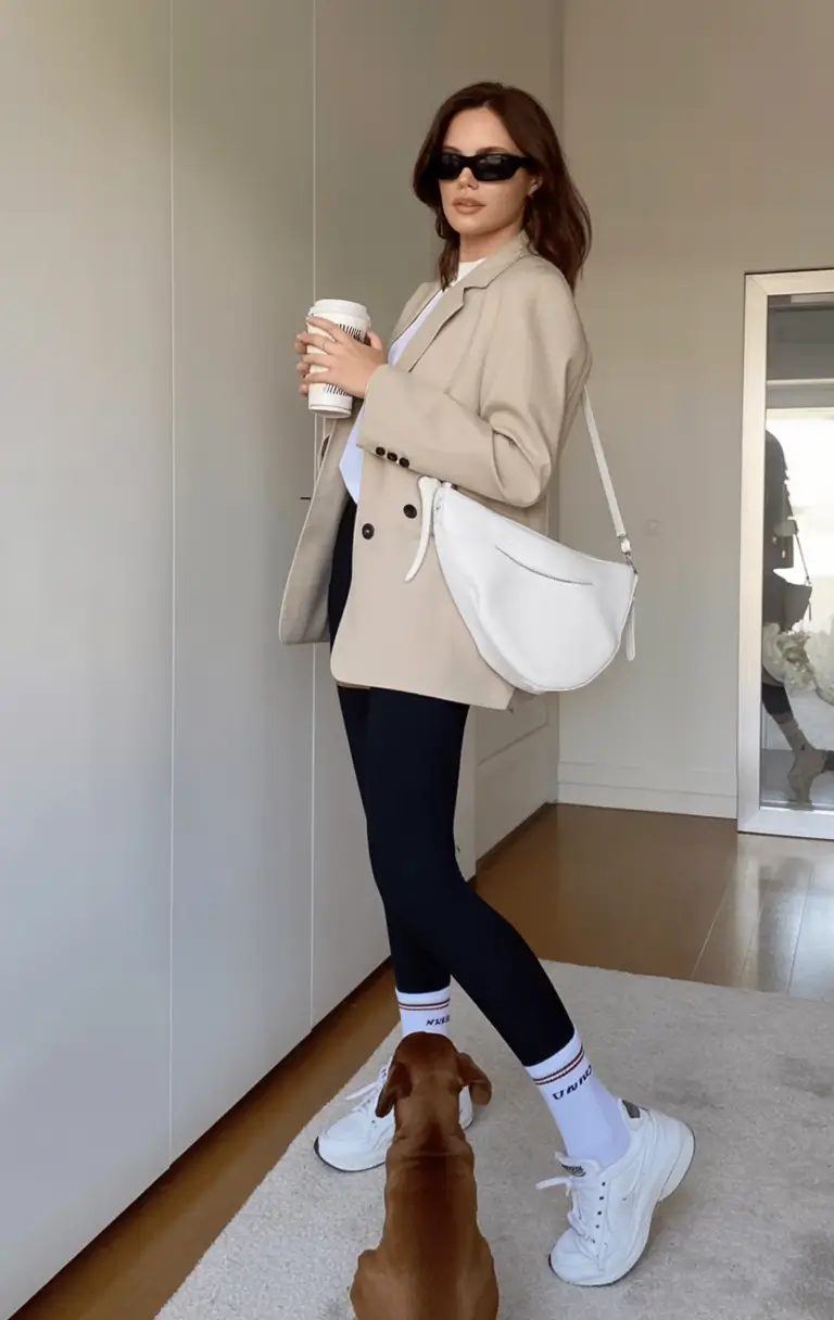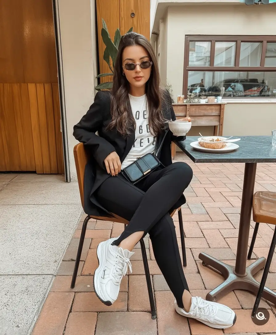 This appearance is the result of the combination of comfort and authority. A well-adorned black blazer over a neat white T-shirt and smooth black leggings transform work-related casual clothes with sneakers. The official aspect is smoothed out by the clean white sneakers, and the mini crossbody bag is the city-sleek finish to the whole outfit that is both useful and trendy.