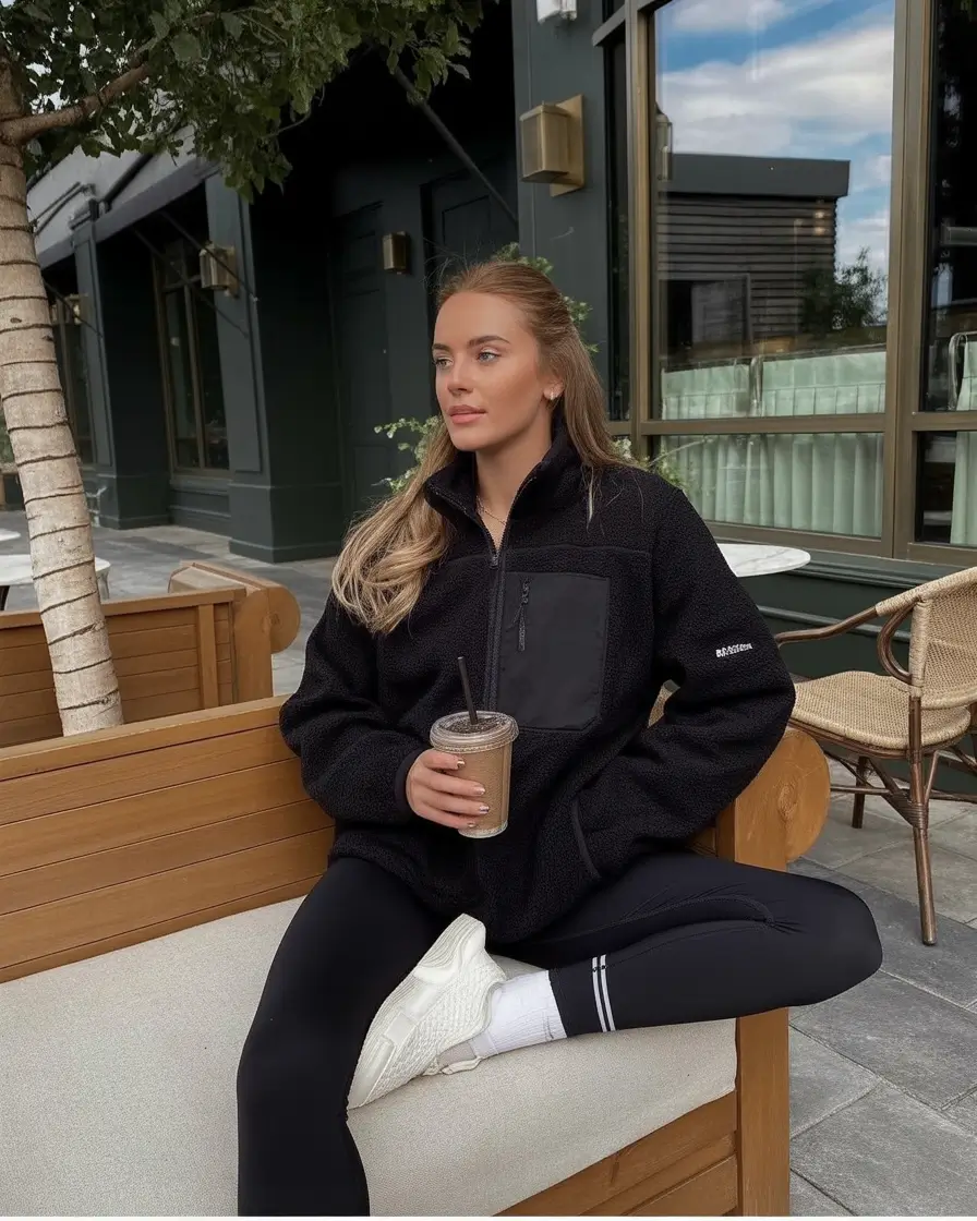 It is a uniform that can be used in the mornings when one is walking to take coffee and during grocery shopping and even off-office days. The fleece is cozy, the sneakers are comfortable, and all these put everyday life in an unexpectedly luxurious look.