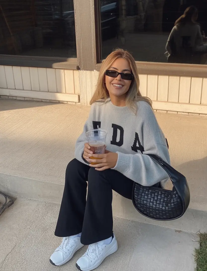 It has a particular beauty in the match between something as warm and nostalgic as a massive knit and sneakers. A large sweater is light gray and has big letters, which is not too formal and is intended to be worn deliberately, though in combination with wide black trousers and white trainers. The formal black shoulder bag is a way to create contrast and polish, which is evidence that women can make their casual clothes with sneakers look relaxed and cool at the same time without losing the comfortable neatness.