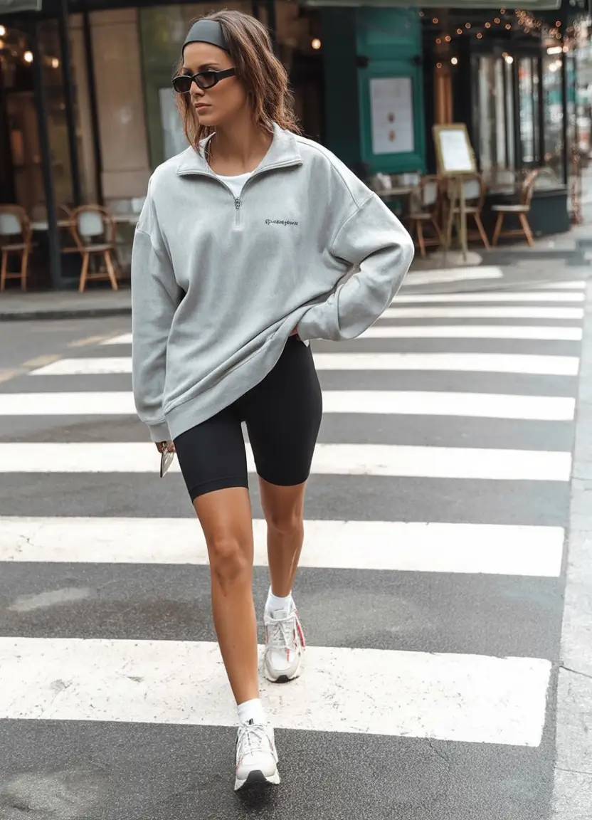Grey colors possess a magical effect, they are stabilizing, clean, and adaptable indefinitely. This oversized light gray sweatshirt in combination with smooth black biker shorts has all the things that I adore about casual attire with singlet shoes in summer. It is sportive but urban, comfortable but self-assured. The white sneakers are also bright and the headband gives the face a retro look.