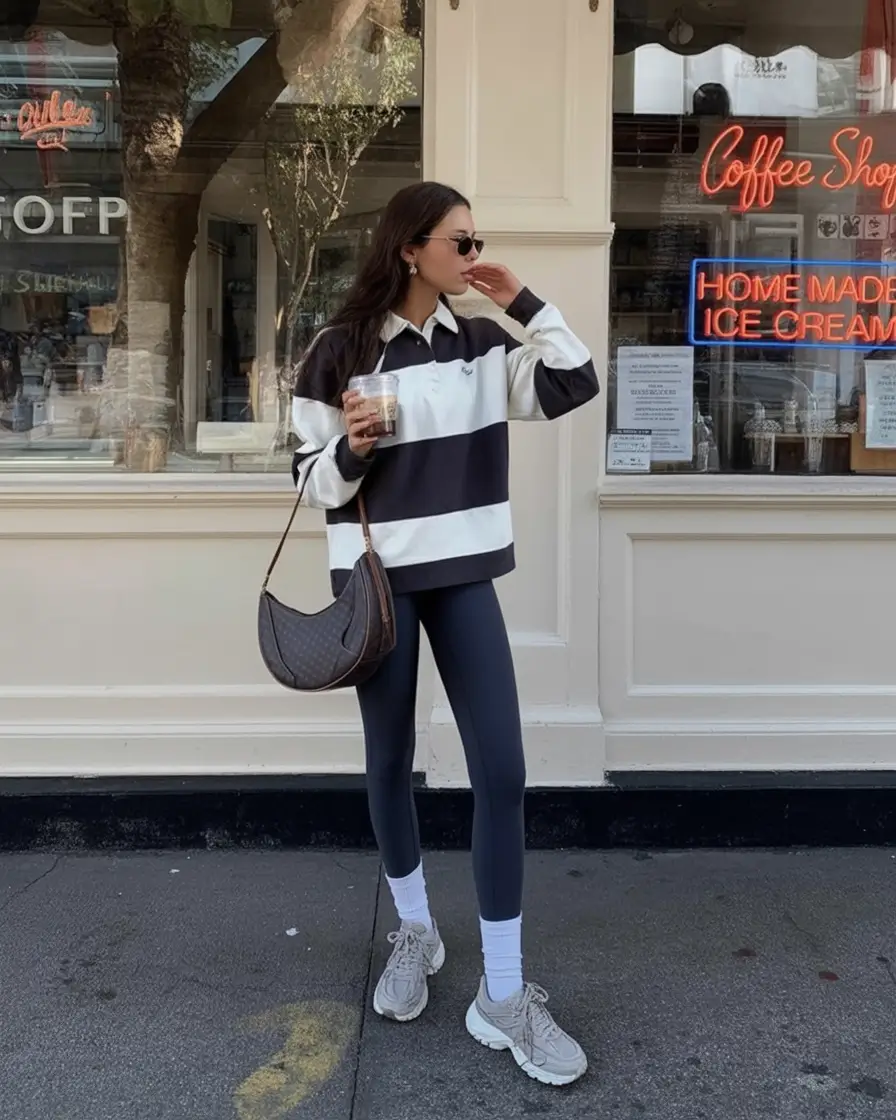 The rugby-themed striped sweater is cool always. Black-and-white stripes and a pair of deep-charcoal leggings with huge sneakers make those desires of the ideal nostalgic but new atmosphere. A shoulder bag is to be kept in brown, add small round sunglasses, and you will have an elegant yet casual pair of outfits that sneaker black women have to wear, sturdy, balanced, and full of reserved energy.