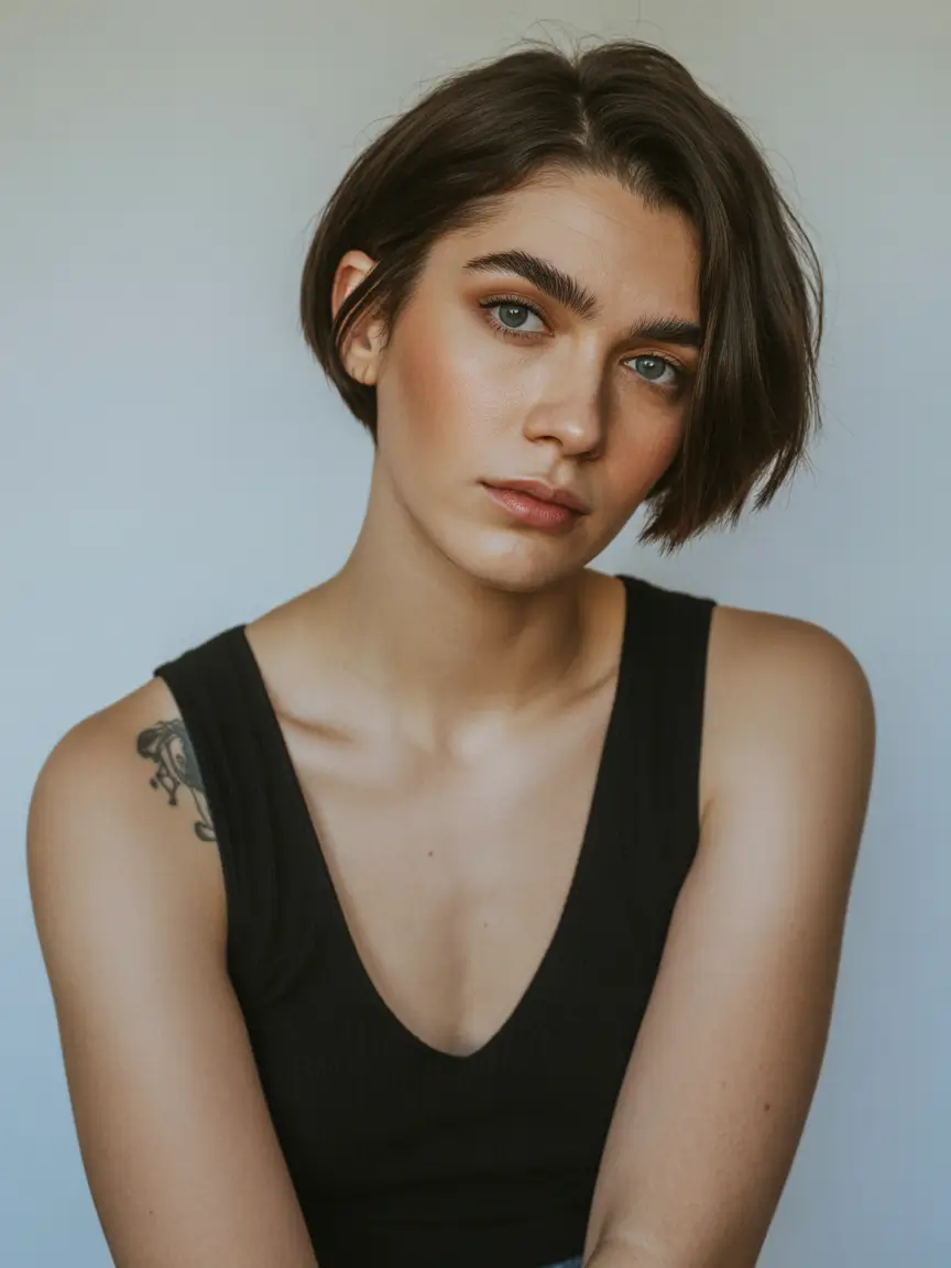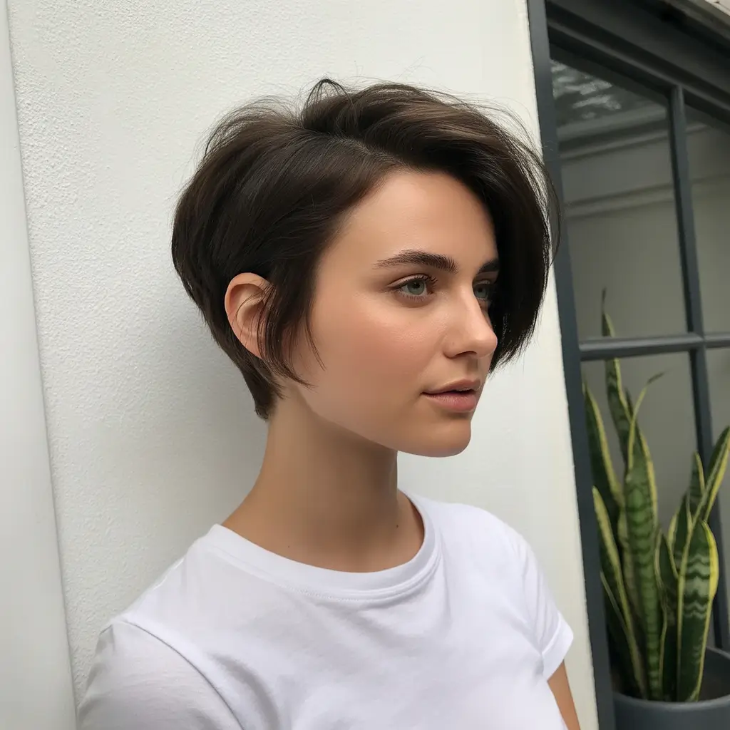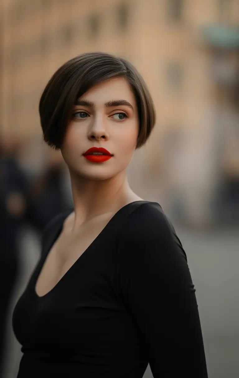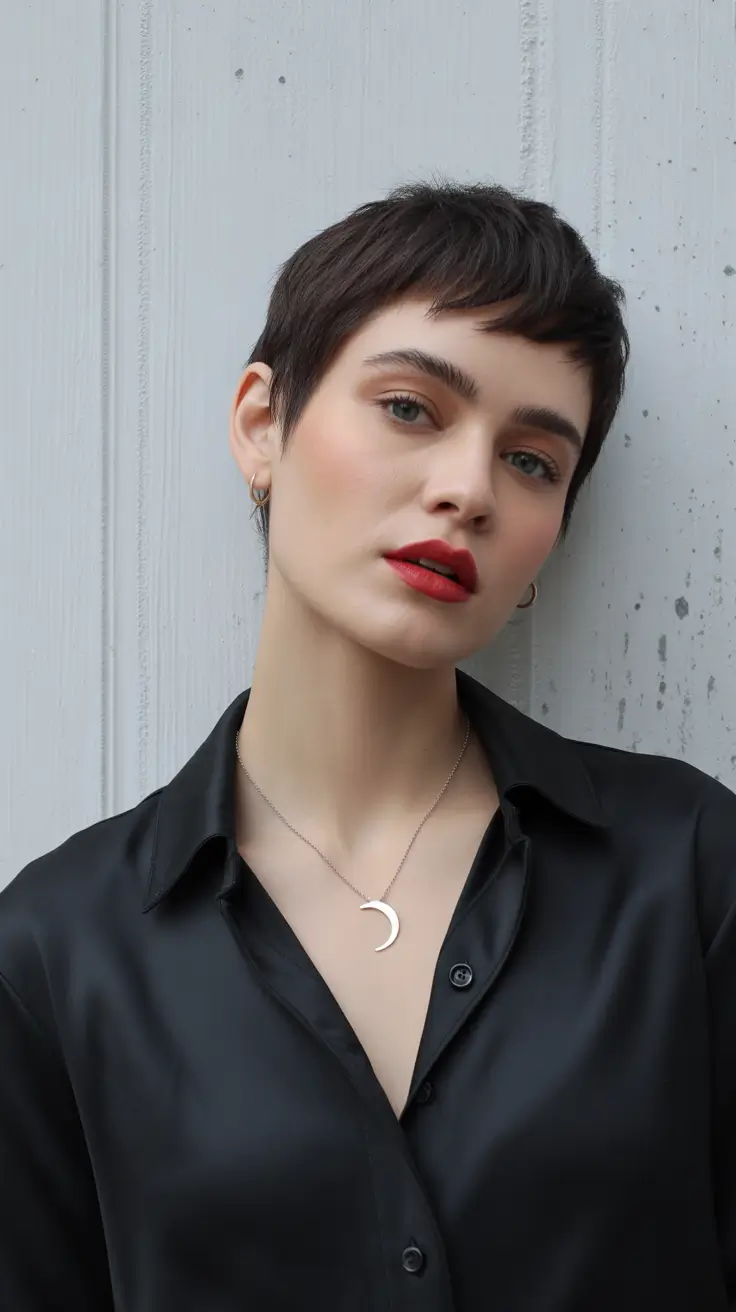 It is a haircut that can be called quiet allure: it is smooth, subtle, and full of personality. The side-swept front has the right amount of asymmetry to make it feel modern, and the length of the jawline has a feel of grounded femininity. It is one of those winter pixie cuts which somehow appears easy and planned at the same time, which is just what you want on a day when you are in that position and you need your hair to cooperate with oversized coats and high-collars.