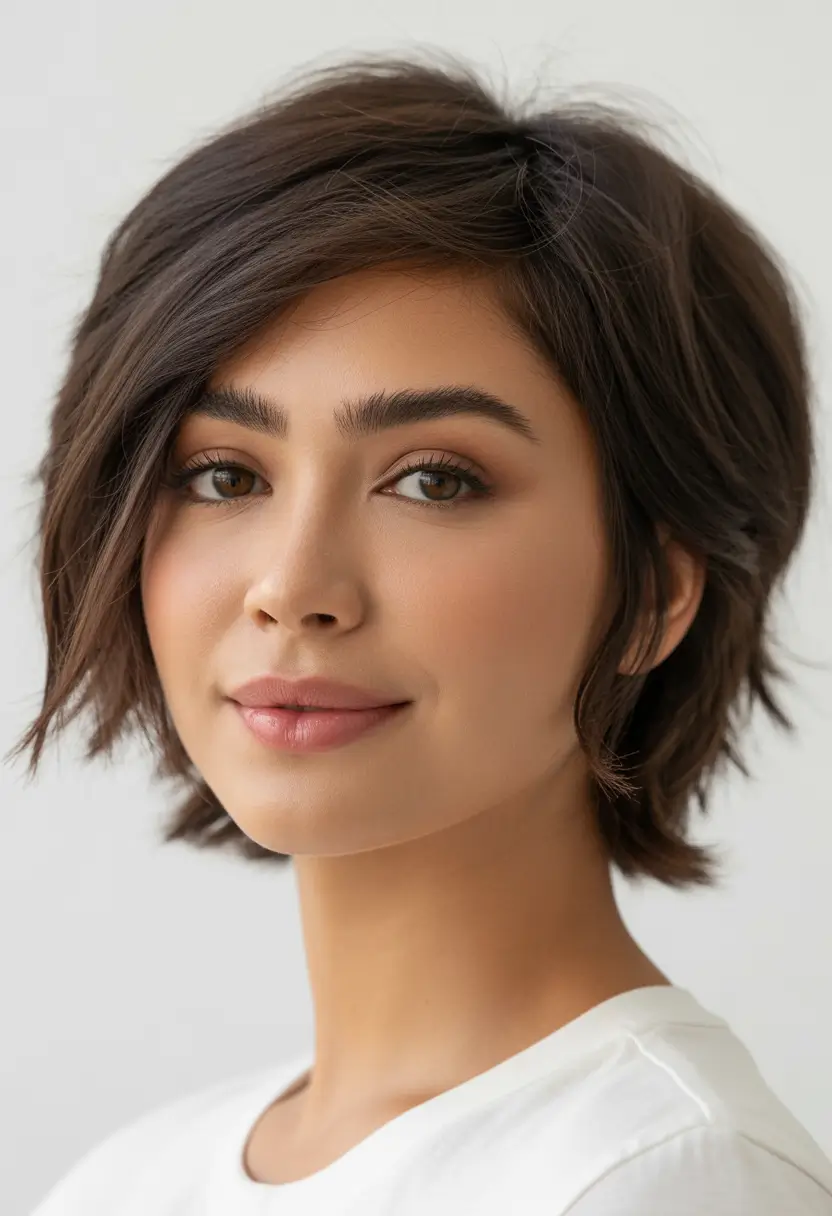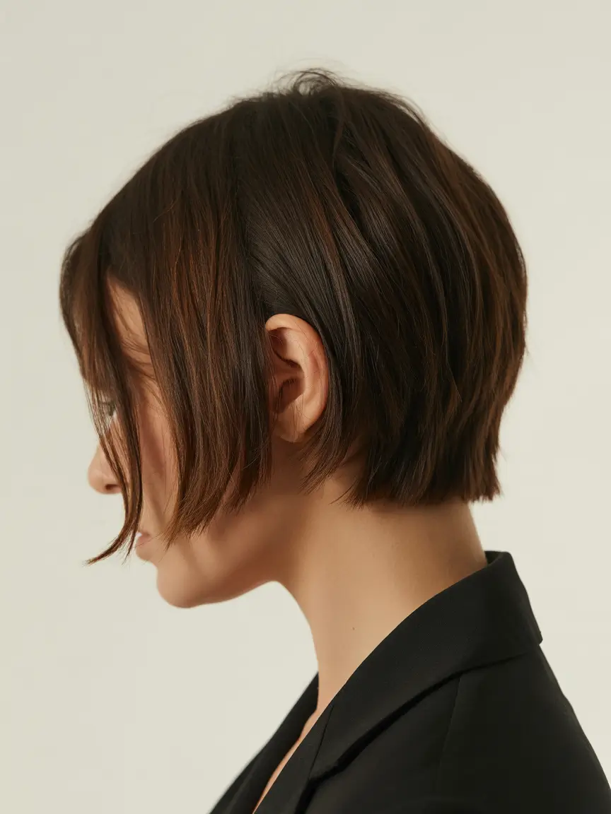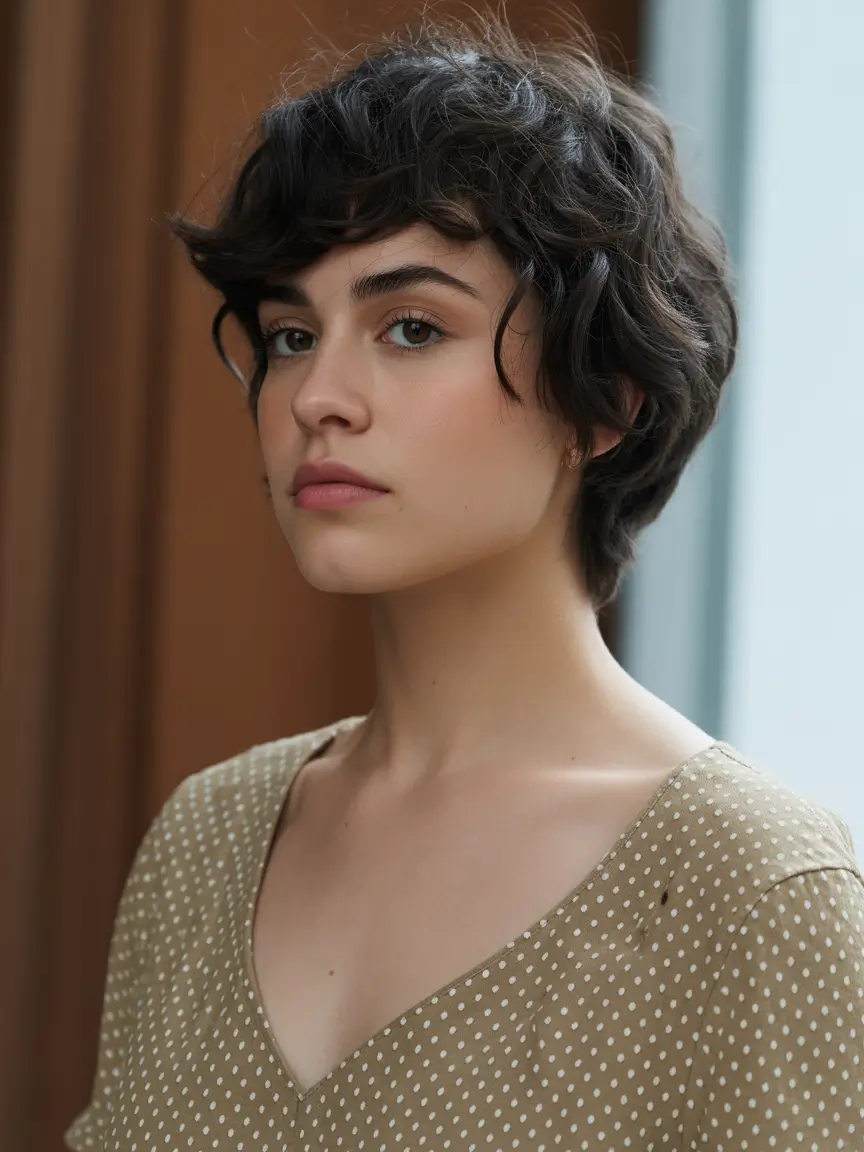 It is a haircut that can be called quiet allure: it is smooth, subtle, and full of personality. The side-swept front has the right amount of asymmetry to make it feel modern, and the length of the jawline has a feel of grounded femininity. It is one of those winter pixie cuts which somehow appears easy and planned at the same time, which is just what you want on a day when you are in that position and you need your hair to cooperate with oversized coats and high-collars.