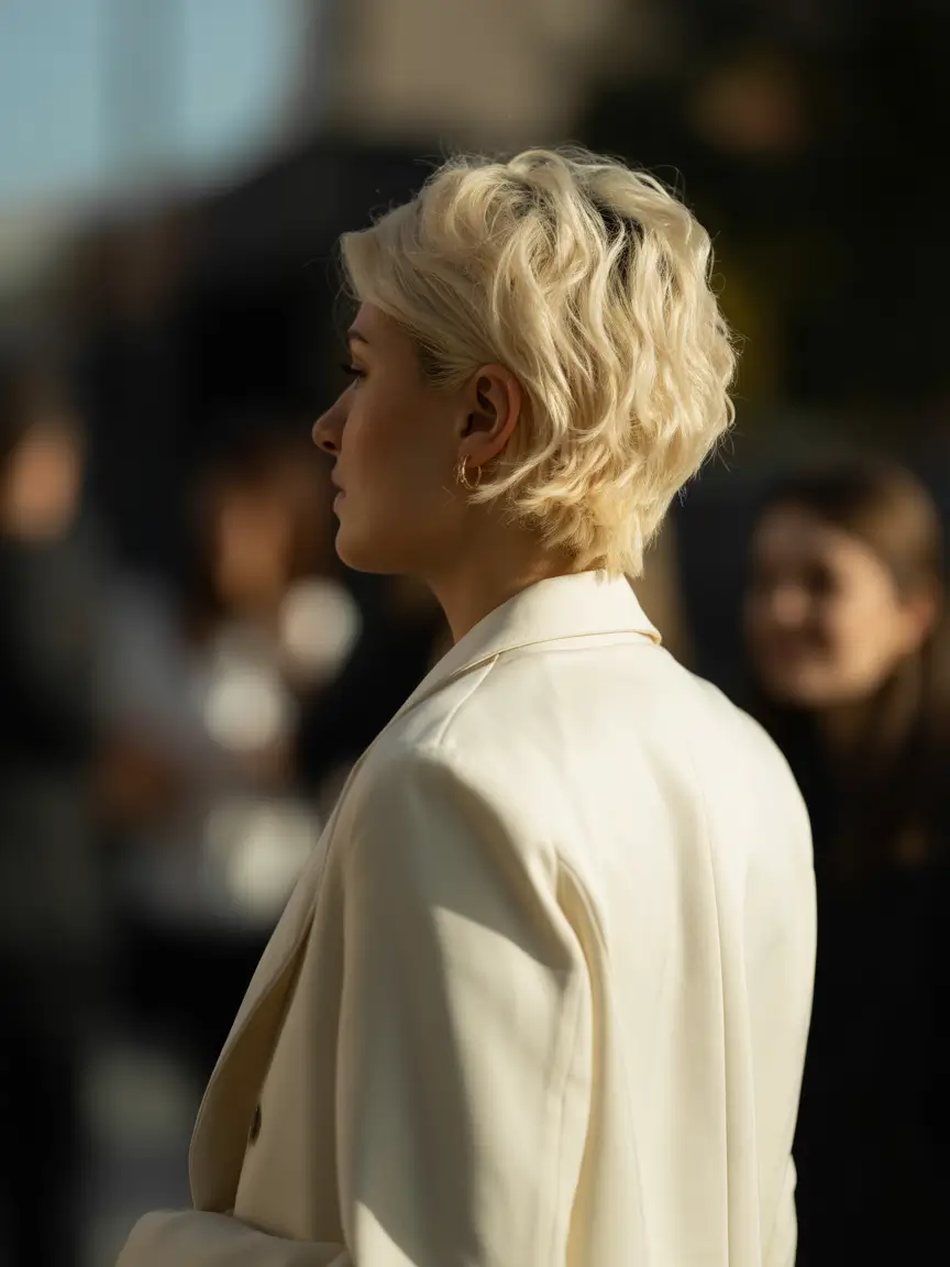 Simplicity is power, and this frozen blonde crop is evidence of that. It is short and sculpted and slightly wavy and is one of those winter pixie haircuts that shine in the sunlight and on the streetlamps. It is the type of cut, which does not require accessories, it is the accessory.