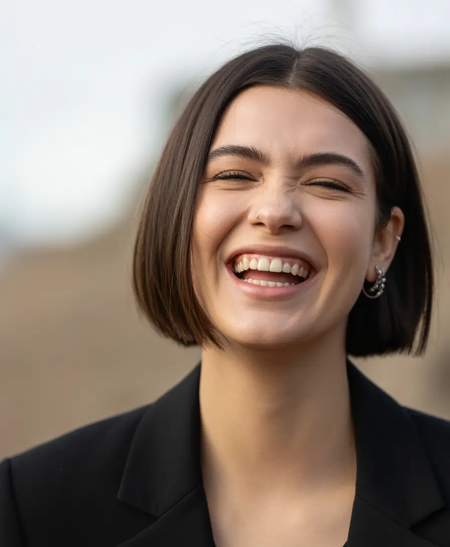 Refined, even and whisper-light – this smooth neutral bob-pixie is the definition of clean beauty. The gently rounded fringe touches the eyebrows, and the straightness of the lines on the jaw makes it look structured almost architectural. The haircut I imagine when I think of quiet luxury is sophisticated, delicate, and unforgettable.