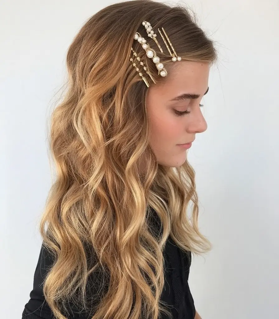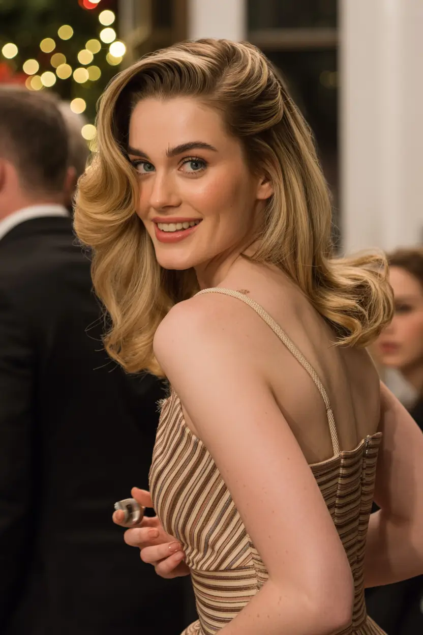 Something about golden waves, soft and effortlessly elegant, there is something so appealing about them as they catch the light like a bubbling champagne. This appearance fits well into the medium trends of christmas party hairstyles- it is glam and wearable, polished and soft. The cozy blonde and soft waves generate that old Hollywood vibe that is cozy enough to celebrate the nights over. I adore the way the hair is framing the face and the tiny golden accolade is just creating a slight sparkle and does not grab any attention.