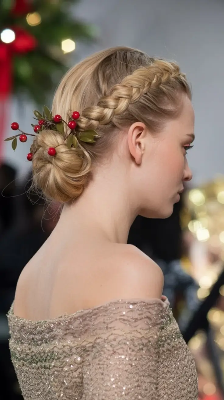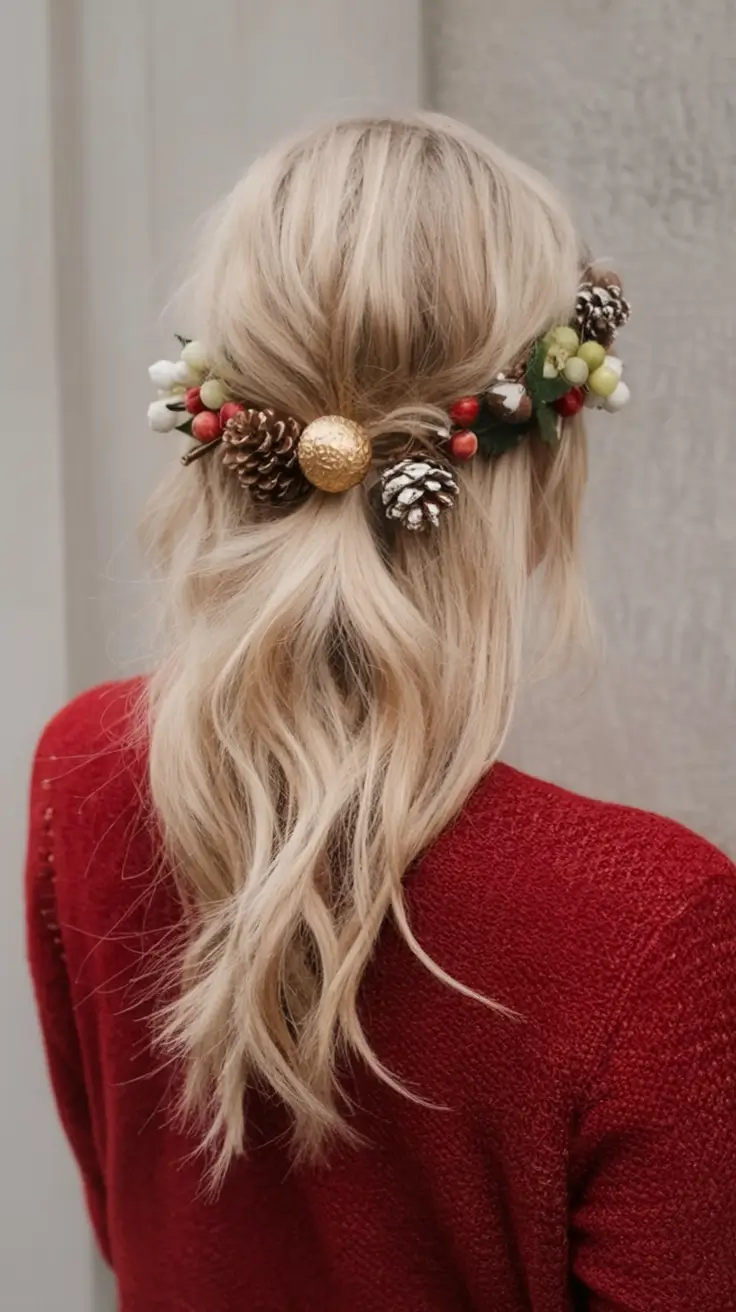 This one has to be mentioned, this one stole my heart at first. Something uniquely organic about this half-up style is that it is almost as though you are putting a miniature Christmas wreath in your hair. The golden pinecones, small-red berries and natural greens are what make this appearance the best of the medium simple trends of christmas party hairstyles in 2025.