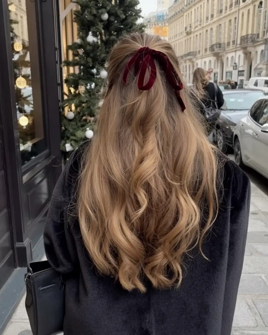 It is the type of hairstyle that unites fashion and festivity without being kitsch. You can wear it along with a velvet dress or even a warm knit and feel like a glamour. The neutral sounds work well with light hair or natural caramel and it gives the appearance of the golden-hour glow.