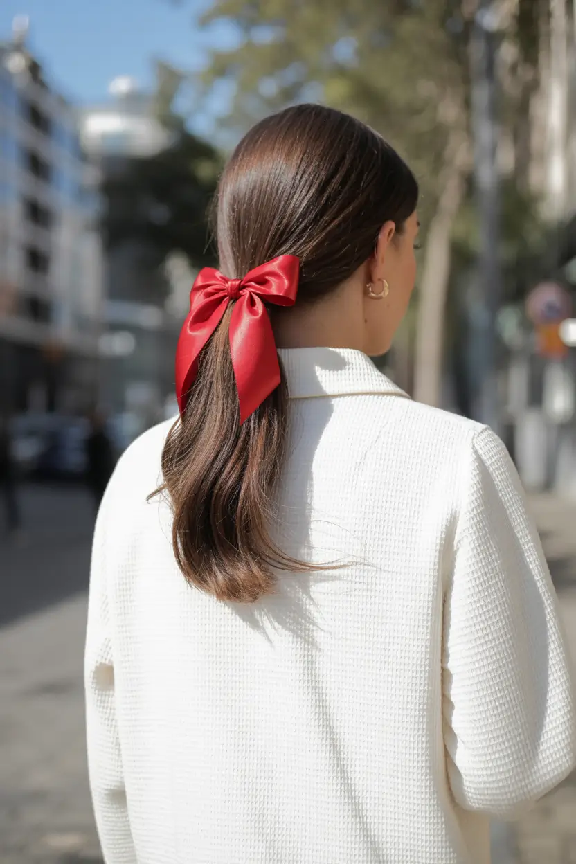 Like the red bow, it is one accessory that characterizes the holidays. Combined with a smooth, low pony-tail it is the quintessence of sleek minimalism the style that does not seem out of place at either a brunch in the city or at a Christmas party. This is a perfect match of the christmas party hairstyles medium easy trends in 2025 with a hint of polished-but-relaxed everyone enjoys.
