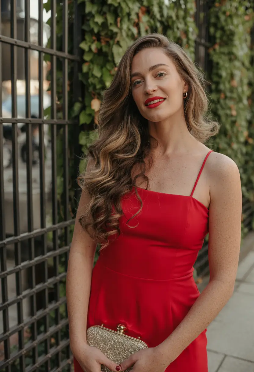 In order to make it, I curl its ends using a 1-inch wand, brushing them to make it soft, and attaching the top part half with a red ribbon. To add that glowing finish, (Olaplex No.7 Bonding Oil) a couple of drops will give you an immediate gloss without being heavy.