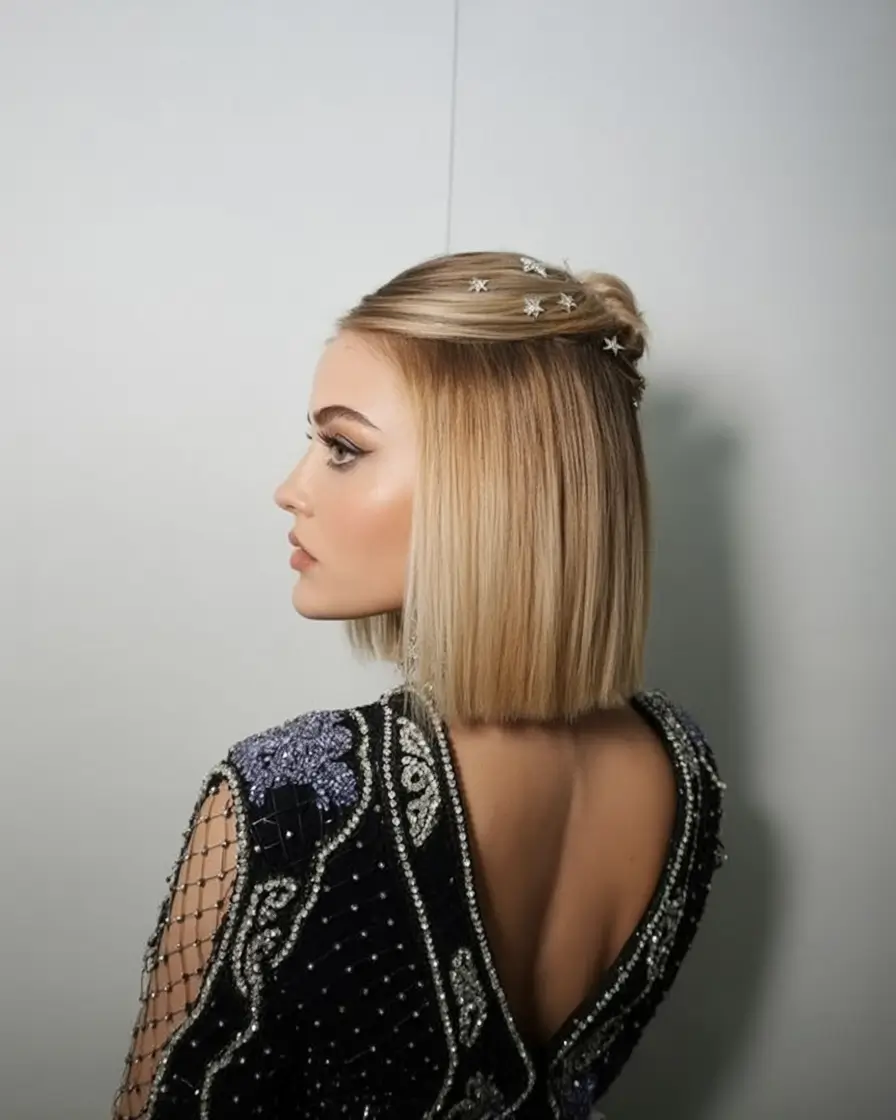 It is a smooth bob with heavenly overtones that is almost a love letter to the sky. The straight, highly polished strands with the use of delicate star clips is one of the most appealing party hairstyles of short hair of 2025, in terms of christmas. It is contemporary, trendy and surprisingly fitting.