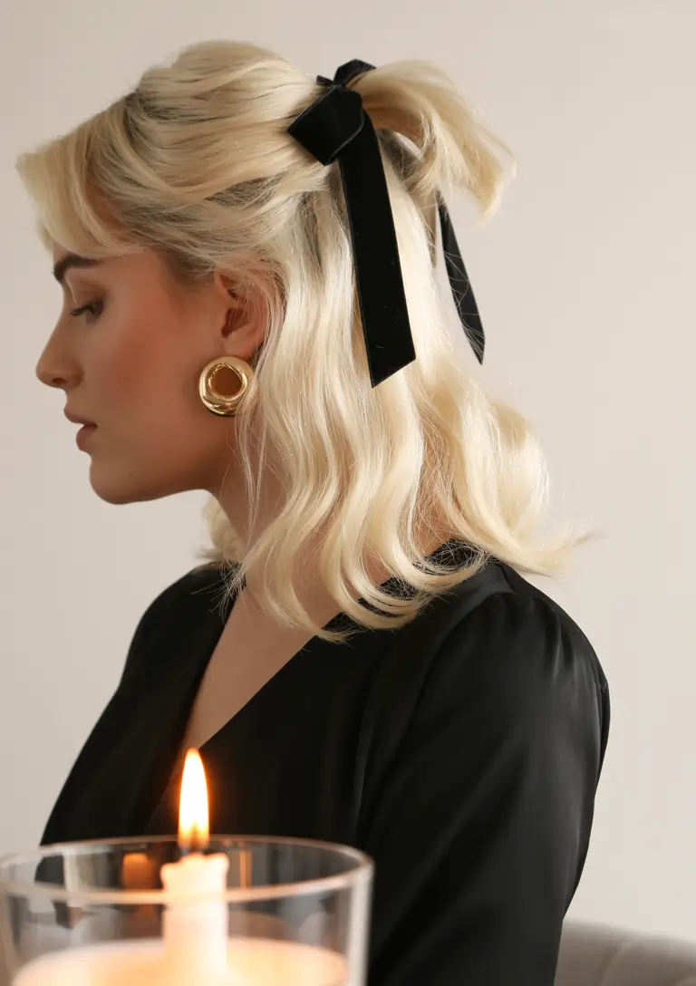 And there is this–all retro perfection. The half-up wearing a black velvet bow is too reminiscent of a holiday movie. It is tender, retro, and so contemporary. It belongs to the the most graceful division of christmas party hairstyles medium and christmas party hairstyles easy since it is elegant within seconds.