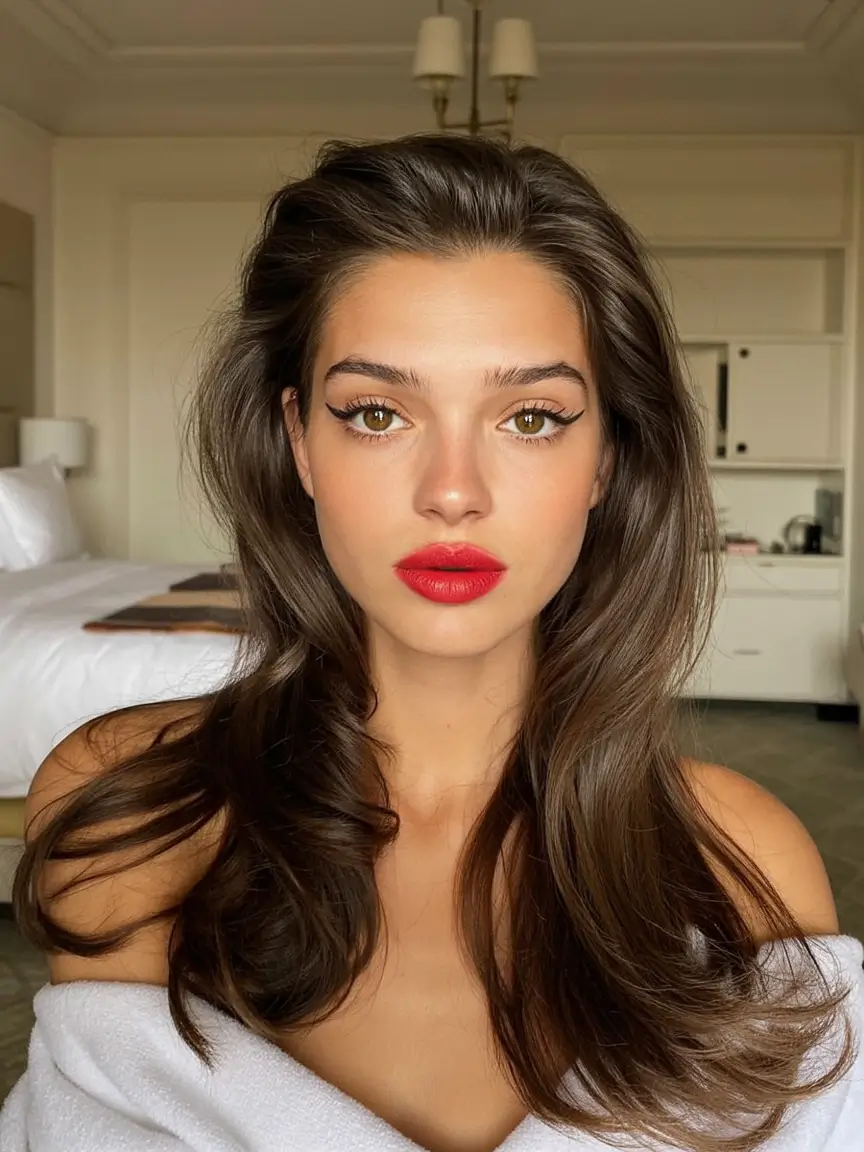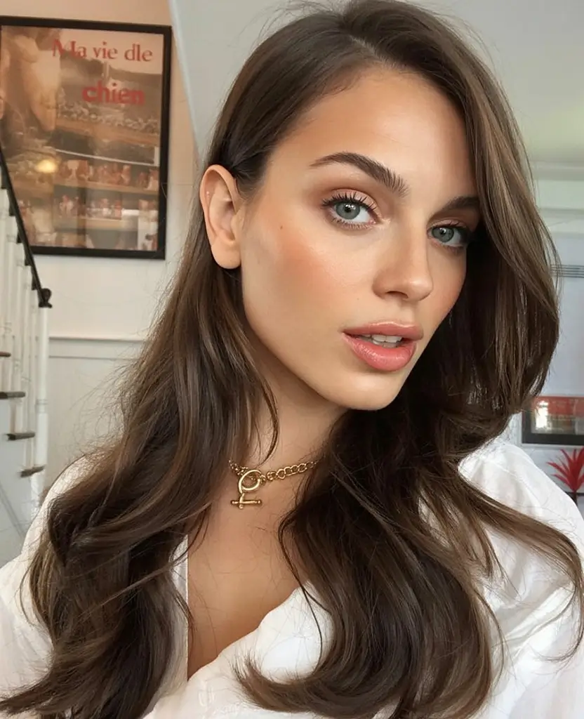 This volume hairstyle is all about breathing – not pushed, not hard. The natural flow and the expensive, glossy brunette shade make it one of the most flattering christmas party hairstyles long easy choices of 2025. Its simplicity is powerful, that airy lift at the top, the ends that are just layered to perfection, and the oily, shiny finish that is like, I woke up like this, but better.