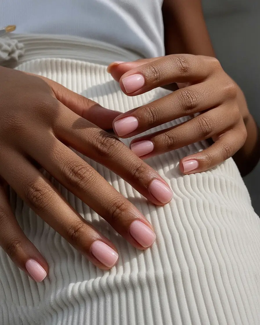 I prefer a high-gloss top coat such as Seche Vite to make this type of finish, and I like OPI Bubble Bath or Essie Mademoiselle. It is just a matter of thin, even application, as well as allowing each layer to dry out adequately – that is what you get that barely painted yet so perfect look.