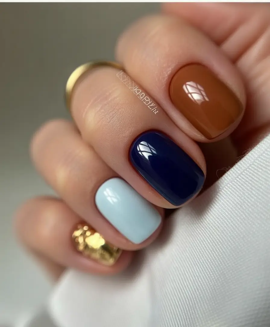 Four basic colors will be needed: baby blue Ice Castle by DND, dark navy ( Essie After School boy Blazer ), honey-brown ( OPI Cliffside Caramel ), and a metallic gold detail ( Butter London Gilded Glitz ). The secret is to ensure that each nail is unique but binds together in a single application that is, it is like creating a mini color story on your hands.