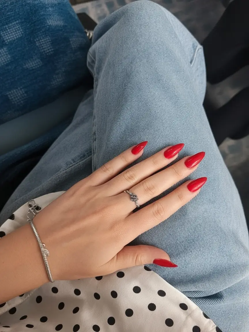 I am obsessed with Essie Really Red or CND Wildfire as the finish on this, both of which leave the finish flawless with a high shine pigment on 2 coats. To shape, I would recommend to keep the tips of almonds smooth and symmetrical -they straighten the fingers and are less harsh than the stilettos even though they appear fierce.