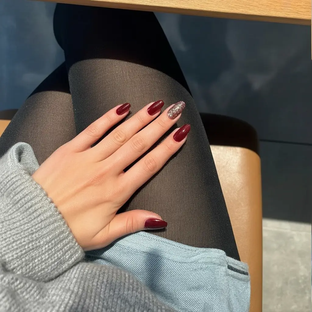 Dark garnet collides with a sprinkle of silver glitter – the mixture shouts of holiday elegance. It is a feeling: warm yet celebratory, modest yet repelling. I love the fact that the silver accent nail reflects the light enough to add a touch of sparkle to it and make it one of the most attractive cute winter nails acrylic designs this year.