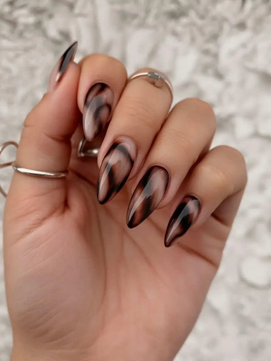 In order to achieve the appearance, apply translucent brown gel shades of GelBottle Cocoa topped with Amber Glass and Black Licorice. The trick lies in layers of them, one rubbed on, then a layer applied over the previous layer to give them that effect of smokiness and depth. It is not challenging, but it is a craft.