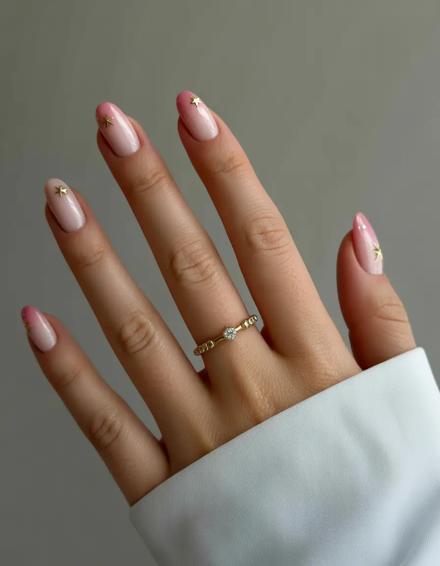 Recreating this requires a soft blush acrylic or gel base (such as the Rose Petal of DND), and then just a few stars of gold foil, either at the end of the cuticle or at the tip and then allowed to dry. Celebrity nail artist Betina Goldstein tends to remind her clients that minimalism is so magical with details, and this design illustrates this.